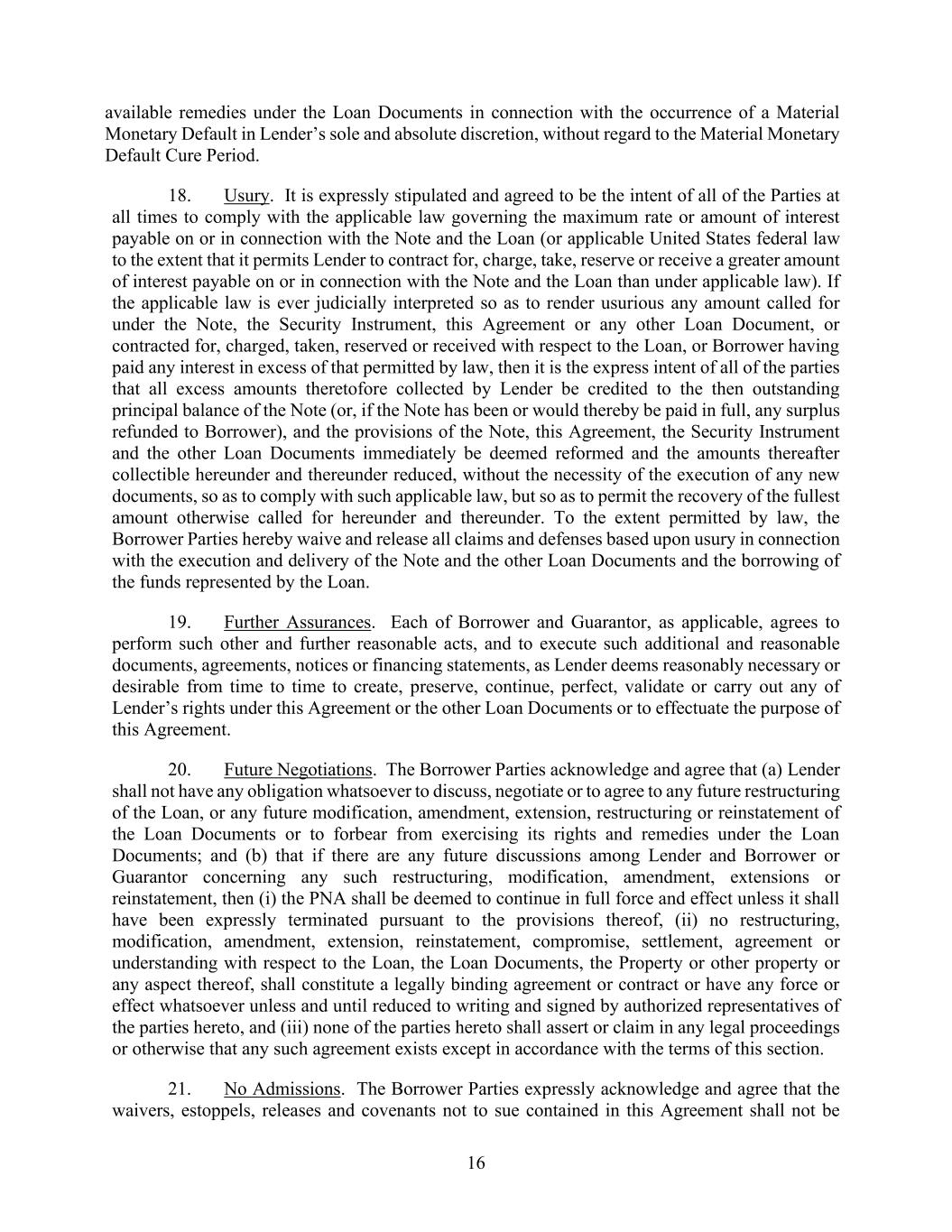 16 available remedies under the Loan Documents in connection with the occurrence of a Material Monetary Default in Lender’s sole and absolute discretion, without regard to the Material Monetary Default Cure Period. 18. Usury. It is expressly stipulated and agreed to be the intent of all of the Parties at all times to comply with the applicable law governing the maximum rate or amount of interest payable on or in connection with the Note and the Loan (or applicable United States federal law to the extent that it permits Lender to contract for, charge, take, reserve or receive a greater amount of interest payable on or in connection with the Note and the Loan than under applicable law). If the applicable law is ever judicially interpreted so as to render usurious any amount called for under the Note, the Security Instrument, this Agreement or any other Loan Document, or contracted for, charged, taken, reserved or received with respect to the Loan, or Borrower having paid any interest in excess of that permitted by law, then it is the express intent of all of the parties that all excess amounts theretofore collected by Lender be credited to the then outstanding principal balance of the Note (or, if the Note has been or would thereby be paid in full, any surplus refunded to Borrower), and the provisions of the Note, this Agreement, the Security Instrument and the other Loan Documents immediately be deemed reformed and the amounts thereafter collectible hereunder and thereunder reduced, without the necessity of the execution of any new documents, so as to comply with such applicable law, but so as to permit the recovery of the fullest amount otherwise called for hereunder and thereunder. To the extent permitted by law, the Borrower Parties hereby waive and release all claims and defenses based upon usury in connection with the execution and delivery of the Note and the other Loan Documents and the borrowing of the funds represented by the Loan. 19. Further Assurances. Each of Borrower and Guarantor, as applicable, agrees to perform such other and further reasonable acts, and to execute such additional and reasonable documents, agreements, notices or financing statements, as Lender deems reasonably necessary or desirable from time to time to create, preserve, continue, perfect, validate or carry out any of Lender’s rights under this Agreement or the other Loan Documents or to effectuate the purpose of this Agreement. 20. Future Negotiations. The Borrower Parties acknowledge and agree that (a) Lender shall not have any obligation whatsoever to discuss, negotiate or to agree to any future restructuring of the Loan, or any future modification, amendment, extension, restructuring or reinstatement of the Loan Documents or to forbear from exercising its rights and remedies under the Loan Documents; and (b) that if there are any future discussions among Lender and Borrower or Guarantor concerning any such restructuring, modification, amendment, extensions or reinstatement, then (i) the PNA shall be deemed to continue in full force and effect unless it shall have been expressly terminated pursuant to the provisions thereof, (ii) no restructuring, modification, amendment, extension, reinstatement, compromise, settlement, agreement or understanding with respect to the Loan, the Loan Documents, the Property or other property or any aspect thereof, shall constitute a legally binding agreement or contract or have any force or effect whatsoever unless and until reduced to writing and signed by authorized representatives of the parties hereto, and (iii) none of the parties hereto shall assert or claim in any legal proceedings or otherwise that any such agreement exists except in accordance with the terms of this section. 21. No Admissions. The Borrower Parties expressly acknowledge and agree that the waivers, estoppels, releases and covenants not to sue contained in this Agreement shall not be