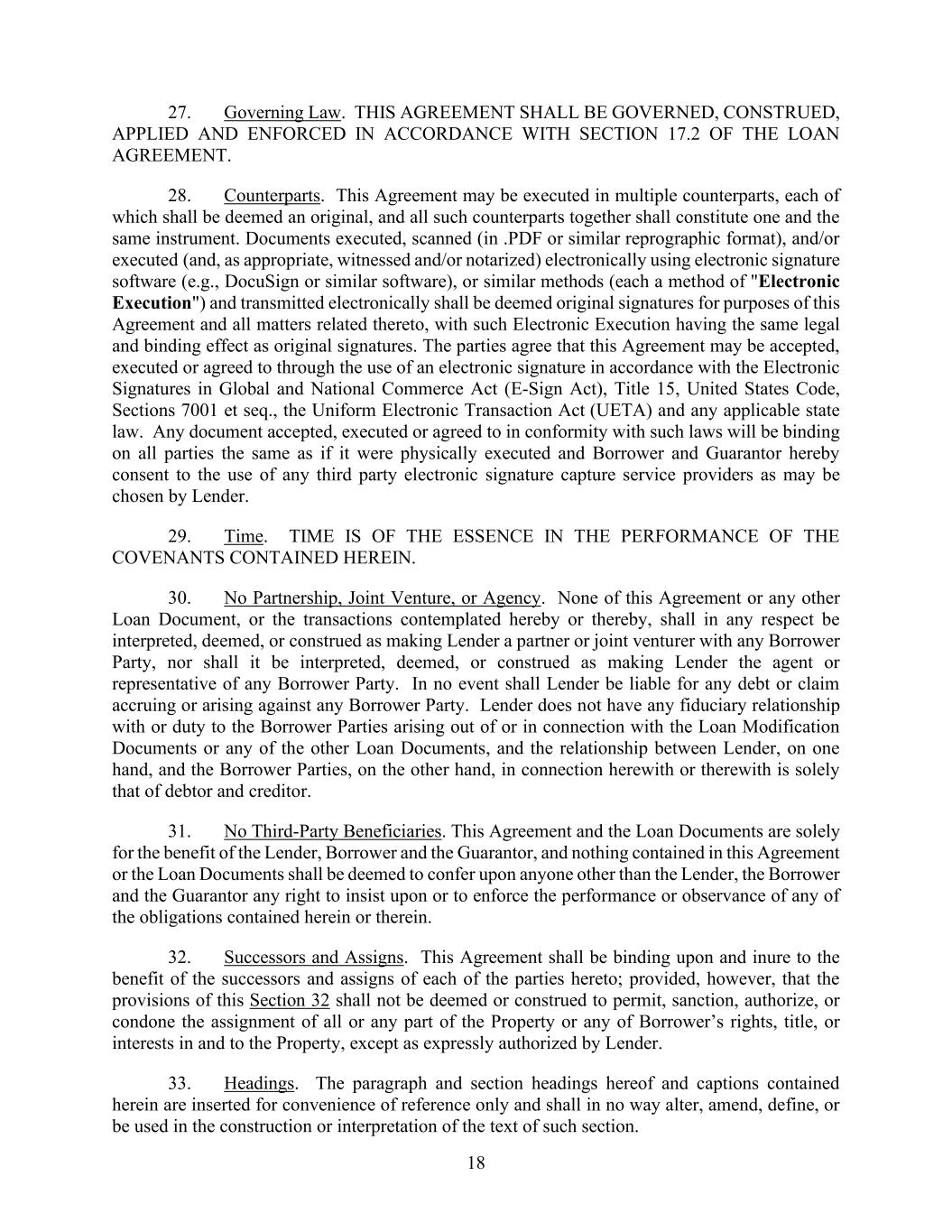 18 27. Governing Law. THIS AGREEMENT SHALL BE GOVERNED, CONSTRUED, APPLIED AND ENFORCED IN ACCORDANCE WITH SECTION 17.2 OF THE LOAN AGREEMENT. 28. Counterparts. This Agreement may be executed in multiple counterparts, each of which shall be deemed an original, and all such counterparts together shall constitute one and the same instrument. Documents executed, scanned (in .PDF or similar reprographic format), and/or executed (and, as appropriate, witnessed and/or notarized) electronically using electronic signature software (e.g., DocuSign or similar software), or similar methods (each a method of "Electronic Execution") and transmitted electronically shall be deemed original signatures for purposes of this Agreement and all matters related thereto, with such Electronic Execution having the same legal and binding effect as original signatures. The parties agree that this Agreement may be accepted, executed or agreed to through the use of an electronic signature in accordance with the Electronic Signatures in Global and National Commerce Act (E-Sign Act), Title 15, United States Code, Sections 7001 et seq., the Uniform Electronic Transaction Act (UETA) and any applicable state law. Any document accepted, executed or agreed to in conformity with such laws will be binding on all parties the same as if it were physically executed and Borrower and Guarantor hereby consent to the use of any third party electronic signature capture service providers as may be chosen by Lender. 29. Time. TIME IS OF THE ESSENCE IN THE PERFORMANCE OF THE COVENANTS CONTAINED HEREIN. 30. No Partnership, Joint Venture, or Agency. None of this Agreement or any other Loan Document, or the transactions contemplated hereby or thereby, shall in any respect be interpreted, deemed, or construed as making Lender a partner or joint venturer with any Borrower Party, nor shall it be interpreted, deemed, or construed as making Lender the agent or representative of any Borrower Party. In no event shall Lender be liable for any debt or claim accruing or arising against any Borrower Party. Lender does not have any fiduciary relationship with or duty to the Borrower Parties arising out of or in connection with the Loan Modification Documents or any of the other Loan Documents, and the relationship between Lender, on one hand, and the Borrower Parties, on the other hand, in connection herewith or therewith is solely that of debtor and creditor. 31. No Third-Party Beneficiaries. This Agreement and the Loan Documents are solely for the benefit of the Lender, Borrower and the Guarantor, and nothing contained in this Agreement or the Loan Documents shall be deemed to confer upon anyone other than the Lender, the Borrower and the Guarantor any right to insist upon or to enforce the performance or observance of any of the obligations contained herein or therein. 32. Successors and Assigns. This Agreement shall be binding upon and inure to the benefit of the successors and assigns of each of the parties hereto; provided, however, that the provisions of this Section 32 shall not be deemed or construed to permit, sanction, authorize, or condone the assignment of all or any part of the Property or any of Borrower’s rights, title, or interests in and to the Property, except as expressly authorized by Lender. 33. Headings. The paragraph and section headings hereof and captions contained herein are inserted for convenience of reference only and shall in no way alter, amend, define, or be used in the construction or interpretation of the text of such section.