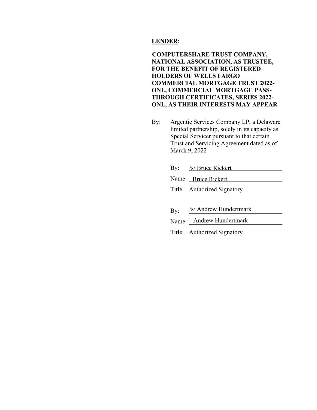 /s/ Bruce Rickert Bruce Rickert /s/ Andrew Hundertmark Andrew Hundertmark LENDER: COMPUTERSHARE TRUST COMPANY, NATIONAL ASSOCIATION, AS TRUSTEE, FOR THE BENEFIT OF REGISTERED HOLDERS OF WELLS FARGO COMMERCIAL MORTGAGE TRUST 2022- ONL, COMMERCIAL MORTGAGE PASS- THROUGH CERTIFICATES, SERIES 2022- ONL, AS THEIR INTERESTS MAY APPEAR By: Argentic Services Company LP, a Delaware limited partnership, solely in its capacity as Special Servicer pursuant to that certain Trust and Servicing Agreement dated as of March 9, 2022 By: Name: ______________________________ Title: Authorized Signatory By: Name: ______________________________ Title: Authorized Signatory T l e :
