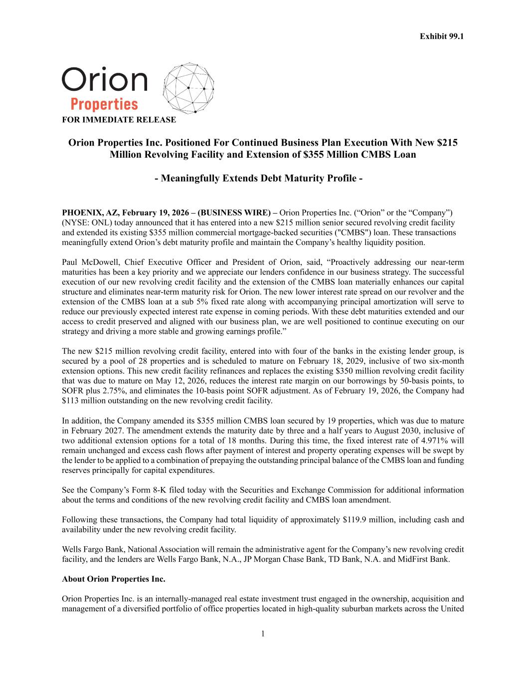 Exhibit 99.1 1 FOR IMMEDIATE RELEASE Orion Properties Inc. Positioned For Continued Business Plan Execution With New $215 Million Revolving Facility and Extension of $355 Million CMBS Loan - Meaningfully Extends Debt Maturity Profile - PHOENIX, AZ, February 19, 2026 – (BUSINESS WIRE) – Orion Properties Inc. (“Orion” or the “Company”) (NYSE: ONL) today announced that it has entered into a new $215 million senior secured revolving credit facility and extended its existing $355 million commercial mortgage-backed securities ("CMBS") loan. These transactions meaningfully extend Orion’s debt maturity profile and maintain the Company’s healthy liquidity position. Paul McDowell, Chief Executive Officer and President of Orion, said, “Proactively addressing our near-term maturities has been a key priority and we appreciate our lenders confidence in our business strategy. The successful execution of our new revolving credit facility and the extension of the CMBS loan materially enhances our capital structure and eliminates near-term maturity risk for Orion. The new lower interest rate spread on our revolver and the extension of the CMBS loan at a sub 5% fixed rate along with accompanying principal amortization will serve to reduce our previously expected interest rate expense in coming periods. With these debt maturities extended and our access to credit preserved and aligned with our business plan, we are well positioned to continue executing on our strategy and driving a more stable and growing earnings profile.” The new $215 million revolving credit facility, entered into with four of the banks in the existing lender group, is secured by a pool of 28 properties and is scheduled to mature on February 18, 2029, inclusive of two six-month extension options. This new credit facility refinances and replaces the existing $350 million revolving credit facility that was due to mature on May 12, 2026, reduces the interest rate margin on our borrowings by 50-basis points, to SOFR plus 2.75%, and eliminates the 10-basis point SOFR adjustment. As of February 19, 2026, the Company had $113 million outstanding on the new revolving credit facility. In addition, the Company amended its $355 million CMBS loan secured by 19 properties, which was due to mature in February 2027. The amendment extends the maturity date by three and a half years to August 2030, inclusive of two additional extension options for a total of 18 months. During this time, the fixed interest rate of 4.971% will remain unchanged and excess cash flows after payment of interest and property operating expenses will be swept by the lender to be applied to a combination of prepaying the outstanding principal balance of the CMBS loan and funding reserves principally for capital expenditures. See the Company’s Form 8-K filed today with the Securities and Exchange Commission for additional information about the terms and conditions of the new revolving credit facility and CMBS loan amendment. Following these transactions, the Company had total liquidity of approximately $119.9 million, including cash and availability under the new revolving credit facility. Wells Fargo Bank, National Association will remain the administrative agent for the Company’s new revolving credit facility, and the lenders are Wells Fargo Bank, N.A., JP Morgan Chase Bank, TD Bank, N.A. and MidFirst Bank. About Orion Properties Inc. Orion Properties Inc. is an internally-managed real estate investment trust engaged in the ownership, acquisition and management of a diversified portfolio of office properties located in high-quality suburban markets across the United
