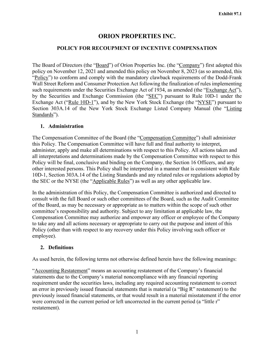 1 ORION PROPERTIES INC. POLICY FOR RECOUPMENT OF INCENTIVE COMPENSATION The Board of Directors (the “Board”) of Orion Properties Inc. (the “Company”) first adopted this policy on November 12, 2021 and amended this policy on November 8, 2023 (as so amended, this “Policy”) to conform and comply with the mandatory clawback requirements of the Dodd-Frank Wall Street Reform and Consumer Protection Act following the finalization of rules implementing such requirements under the Securities Exchange Act of 1934, as amended (the “Exchange Act”), by the Securities and Exchange Commission (the “SEC”) pursuant to Rule 10D-1 under the Exchange Act (“Rule 10D-1”), and by the New York Stock Exchange (the “NYSE”) pursuant to Section 303A.14 of the New York Stock Exchange Listed Company Manual (the “Listing Standards”). 1. Administration The Compensation Committee of the Board (the “Compensation Committee”) shall administer this Policy. The Compensation Committee will have full and final authority to interpret, administer, apply and make all determinations with respect to this Policy. All actions taken and all interpretations and determinations made by the Compensation Committee with respect to this Policy will be final, conclusive and binding on the Company, the Section 16 Officers, and any other interested persons. This Policy shall be interpreted in a manner that is consistent with Rule 10D-1, Section 303A.14 of the Listing Standards and any related rules or regulations adopted by the SEC or the NYSE (the “Applicable Rules”) as well as any other applicable law. In the administration of this Policy, the Compensation Committee is authorized and directed to consult with the full Board or such other committees of the Board, such as the Audit Committee of the Board, as may be necessary or appropriate as to matters within the scope of such other committee’s responsibility and authority. Subject to any limitation at applicable law, the Compensation Committee may authorize and empower any officer or employee of the Company to take any and all actions necessary or appropriate to carry out the purpose and intent of this Policy (other than with respect to any recovery under this Policy involving such officer or employee). 2. Definitions As used herein, the following terms not otherwise defined herein have the following meanings: “Accounting Restatement” means an accounting restatement of the Company’s financial statements due to the Company’s material noncompliance with any financial reporting requirement under the securities laws, including any required accounting restatement to correct an error in previously issued financial statements that is material (a “Big R” restatement) to the previously issued financial statements, or that would result in a material misstatement if the error were corrected in the current period or left uncorrected in the current period (a “little r” restatement). Exhibit 97.1