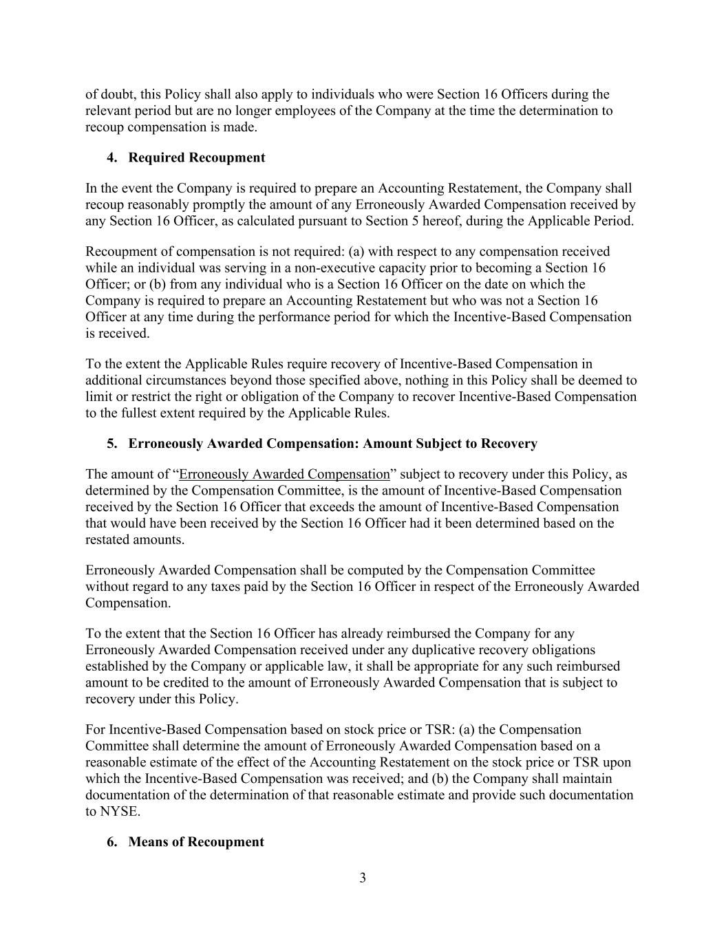 3 of doubt, this Policy shall also apply to individuals who were Section 16 Officers during the relevant period but are no longer employees of the Company at the time the determination to recoup compensation is made. 4. Required Recoupment In the event the Company is required to prepare an Accounting Restatement, the Company shall recoup reasonably promptly the amount of any Erroneously Awarded Compensation received by any Section 16 Officer, as calculated pursuant to Section 5 hereof, during the Applicable Period. Recoupment of compensation is not required: (a) with respect to any compensation received while an individual was serving in a non-executive capacity prior to becoming a Section 16 Officer; or (b) from any individual who is a Section 16 Officer on the date on which the Company is required to prepare an Accounting Restatement but who was not a Section 16 Officer at any time during the performance period for which the Incentive-Based Compensation is received. To the extent the Applicable Rules require recovery of Incentive-Based Compensation in additional circumstances beyond those specified above, nothing in this Policy shall be deemed to limit or restrict the right or obligation of the Company to recover Incentive-Based Compensation to the fullest extent required by the Applicable Rules. 5. Erroneously Awarded Compensation: Amount Subject to Recovery The amount of “Erroneously Awarded Compensation” subject to recovery under this Policy, as determined by the Compensation Committee, is the amount of Incentive-Based Compensation received by the Section 16 Officer that exceeds the amount of Incentive-Based Compensation that would have been received by the Section 16 Officer had it been determined based on the restated amounts. Erroneously Awarded Compensation shall be computed by the Compensation Committee without regard to any taxes paid by the Section 16 Officer in respect of the Erroneously Awarded Compensation. To the extent that the Section 16 Officer has already reimbursed the Company for any Erroneously Awarded Compensation received under any duplicative recovery obligations established by the Company or applicable law, it shall be appropriate for any such reimbursed amount to be credited to the amount of Erroneously Awarded Compensation that is subject to recovery under this Policy. For Incentive-Based Compensation based on stock price or TSR: (a) the Compensation Committee shall determine the amount of Erroneously Awarded Compensation based on a reasonable estimate of the effect of the Accounting Restatement on the stock price or TSR upon which the Incentive-Based Compensation was received; and (b) the Company shall maintain documentation of the determination of that reasonable estimate and provide such documentation to NYSE. 6. Means of Recoupment