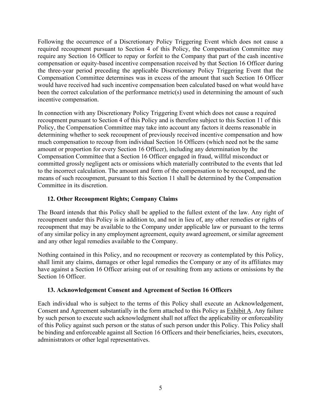 5 Following the occurrence of a Discretionary Policy Triggering Event which does not cause a required recoupment pursuant to Section 4 of this Policy, the Compensation Committee may require any Section 16 Officer to repay or forfeit to the Company that part of the cash incentive compensation or equity-based incentive compensation received by that Section 16 Officer during the three-year period preceding the applicable Discretionary Policy Triggering Event that the Compensation Committee determines was in excess of the amount that such Section 16 Officer would have received had such incentive compensation been calculated based on what would have been the correct calculation of the performance metric(s) used in determining the amount of such incentive compensation. In connection with any Discretionary Policy Triggering Event which does not cause a required recoupment pursuant to Section 4 of this Policy and is therefore subject to this Section 11 of this Policy, the Compensation Committee may take into account any factors it deems reasonable in determining whether to seek recoupment of previously received incentive compensation and how much compensation to recoup from individual Section 16 Officers (which need not be the same amount or proportion for every Section 16 Officer), including any determination by the Compensation Committee that a Section 16 Officer engaged in fraud, willful misconduct or committed grossly negligent acts or omissions which materially contributed to the events that led to the incorrect calculation. The amount and form of the compensation to be recouped, and the means of such recoupment, pursuant to this Section 11 shall be determined by the Compensation Committee in its discretion. 12. Other Recoupment Rights; Company Claims The Board intends that this Policy shall be applied to the fullest extent of the law. Any right of recoupment under this Policy is in addition to, and not in lieu of, any other remedies or rights of recoupment that may be available to the Company under applicable law or pursuant to the terms of any similar policy in any employment agreement, equity award agreement, or similar agreement and any other legal remedies available to the Company. Nothing contained in this Policy, and no recoupment or recovery as contemplated by this Policy, shall limit any claims, damages or other legal remedies the Company or any of its affiliates may have against a Section 16 Officer arising out of or resulting from any actions or omissions by the Section 16 Officer. 13. Acknowledgement Consent and Agreement of Section 16 Officers Each individual who is subject to the terms of this Policy shall execute an Acknowledgement, Consent and Agreement substantially in the form attached to this Policy as Exhibit A. Any failure by such person to execute such acknowledgment shall not affect the applicability or enforceability of this Policy against such person or the status of such person under this Policy. This Policy shall be binding and enforceable against all Section 16 Officers and their beneficiaries, heirs, executors, administrators or other legal representatives.