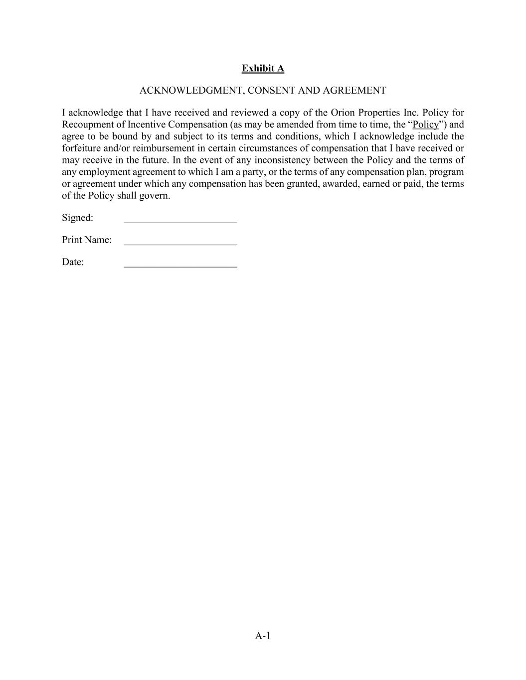 A-1 Exhibit A ACKNOWLEDGMENT, CONSENT AND AGREEMENT I acknowledge that I have received and reviewed a copy of the Orion Properties Inc. Policy for Recoupment of Incentive Compensation (as may be amended from time to time, the “Policy”) and agree to be bound by and subject to its terms and conditions, which I acknowledge include the forfeiture and/or reimbursement in certain circumstances of compensation that I have received or may receive in the future. In the event of any inconsistency between the Policy and the terms of any employment agreement to which I am a party, or the terms of any compensation plan, program or agreement under which any compensation has been granted, awarded, earned or paid, the terms of the Policy shall govern. Signed: ______________________ Print Name: ______________________ Date: ______________________