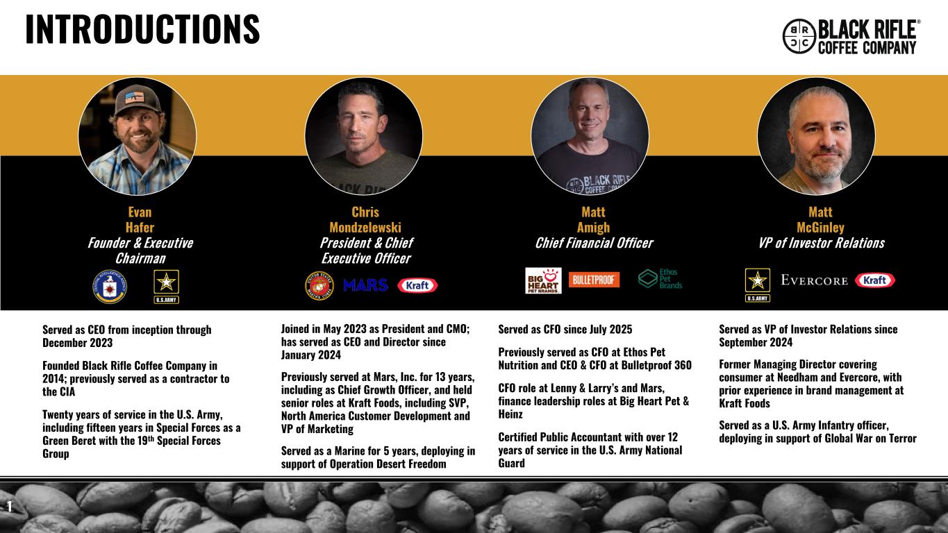 1 INTRODUCTIONS Joined in May 2023 as President and CMO; has served as CEO and Director since January 2024 Previously served at Mars, Inc. for 13 years, including as Chief Growth Officer, and held senior roles at Kraft Foods, including SVP, North America Customer Development and VP of Marketing Served as a Marine for 5 years, deploying in support of Operation Desert Freedom Served as CFO since July 2025 Previously served as CFO at Ethos Pet Nutrition and CEO & CFO at Bulletproof 360 CFO role at Lenny & Larry’s and Mars, finance leadership roles at Big Heart Pet & Heinz Certified Public Accountant with over 12 years of service in the U.S. Army National Guard Matt Amigh Chief Financial Officer Served as VP of Investor Relations since September 2024 Former Managing Director covering consumer at Needham and Evercore, with prior experience in brand management at Kraft Foods Served as a U.S. Army Infantry officer, deploying in support of Global War on Terror Chris Mondzelewski President & Chief Executive Officer Matt McGinley VP of Investor Relations Served as CEO from inception through December 2023 Founded Black Rifle Coffee Company in 2014; previously served as a contractor to the CIA Twenty years of service in the U.S. Army, including fifteen years in Special Forces as a Green Beret with the 19th Special Forces Group Evan Hafer Founder & Executive Chairman