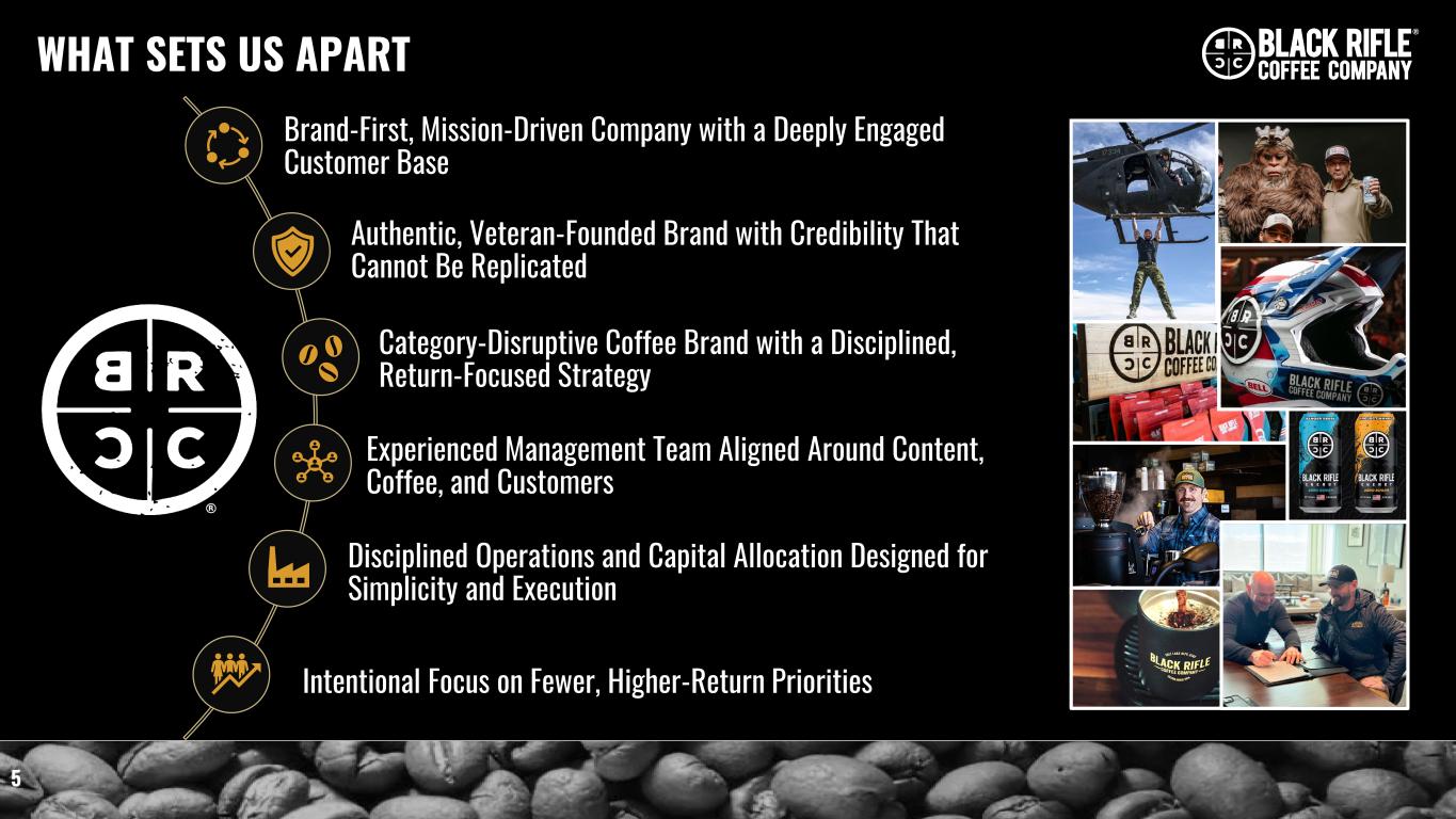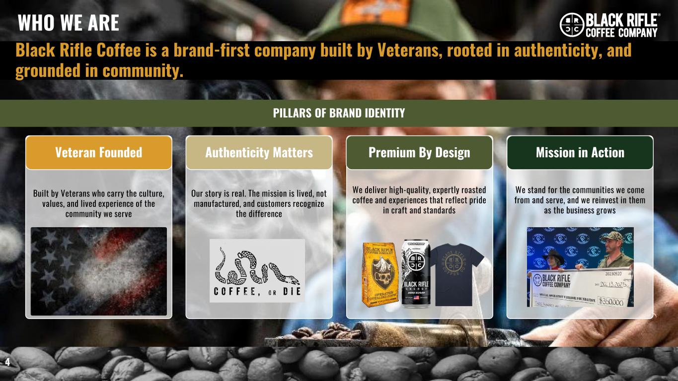 4 Black Rifle Coffee is a brand-first company built by Veterans, rooted in authenticity, and grounded in community. WHO WE ARE PILLARS OF BRAND IDENTITY Authenticity Matters Our story is real. The mission is lived, not manufactured, and customers recognize the difference Veteran Founded Built by Veterans who carry the culture, values, and lived experience of the community we serve Premium By Design We deliver high-quality, expertly roasted coffee and experiences that reflect pride in craft and standards Mission in Action We stand for the communities we come from and serve, and we reinvest in them as the business grows