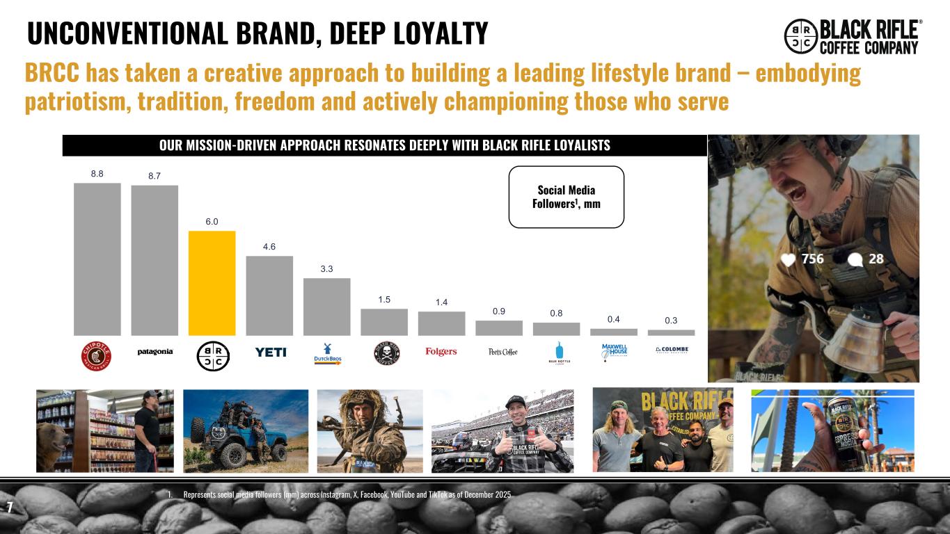2 This investor presentation (this “Presentation”) is for informational purposes only. The information contained herein does not purport to be all-inclusive and none of BRC Inc. (“the Company” “we,” “us,” and “our”) or its respective affiliates makes any representation or warranty, express or implied, as to the accuracy, completeness or reliability of the information contained in this Presentation. The Company has not verified, and will not verify, any part of this Presentation. The recipient should make its own independent investigations and analyses of the Company and its own assessment of all information and material provided, or made available, by the Company or any of its respective directors, officers, employees, affiliates, agents, advisors or representatives. This Presentation does not constitute a solicitation of a proxy, consent or authorization with respect to any securities. This Presentation shall also not constitute an offer to sell, a solicitation of an offer to buy, or a recommendation to purchase any securities. You should consult your own counsel and tax and financial advisors as to legal and related matters concerning the matters described herein, and, by accepting this Presentation, you confirm that you are not relying upon the information contained herein to make any decision. Forward-Looking Statements This presentation contains forward-looking statements about the Company and its industry that involve substantial risks and uncertainties. All statements other than statements of historical fact contained in this presentation, including statements regarding the Company’s intentions, beliefs or current expectations concerning, among other things, the Company’s financial condition, liquidity, prospects, growth, strategies, future market conditions, developments in the capital and credit markets and expected future financial performance, as well as any information concerning possible or assumed future results of operations, are forward-looking statements. In some cases, you can identify forward-looking statements because they contain words such as “anticipate,” “believe,” “continue,” “could,” “estimate,” “expect,” “intend,” “may,” “might,” “plan,” “possible,” “potential, ”predict,” “project,” “should,” “will,” “would” and similar expressions, but the absence of these words does not mean that a statement is not forward-looking. The events and circumstances reflected in the Company’s forward-looking statements may not be achieved or occur and actual results could differ materially from those projected in the forward-looking statements. Factors that may cause such forward-looking statements to differ from actual results include, but are not limited to: competition and our ability to grow, manage sustainable expansion, and retain key employees; failure to compete effectively with other producers, distributors and retailers of coffee and energy drinks; our limited operating history, which may hinder the successful execution of strategic initiatives and make it difficult to assess future risks and challenges; challenges in managing rapid growth, inventory needs, and relationships with key business partners; inability to raise additional capital necessary for business development; failure to achieve or sustain long-term profitability; inability to effectively manage debt obligations; failure to maximize the value of assets received through bartering transactions; negative publicity affecting our brand, reputation, or that of key employees; failure to uphold our position as a supportive member of the Veteran, military and first-responder communities, or other factors negatively affecting brand perception; inability to establish and maintain strong brand recognition through intellectual property or other means; shifts in consumer spending, lack of interest in new products or changes in brand perception upon evolving consumer preferences and tastes, including due to shifts in demographic or health and wellness trends, reduction in discretionary spending and price increases, and our ability to anticipate or react to these changes; price changes that are insufficient to offset cost increases and maintain profitability or that result in sales volume declines associated with pricing elasticity; unsuccessful marketing campaigns that incur costs without attracting new customers or realizing higher revenue; failure to attract new customers or retain existing customers; risks associated with reliance on social media platforms, including dependence on third-party platforms for marketing and engagement; declining performance of the direct to consumer revenue channel; inability to effectively manage or scale distribution through Wholesale business partners, particularly key Wholesale partners; failure to manage supply chain operations effectively, including inaccurate forecasting of raw material and co- manufacturing requirements; loss of one or more co-manufacturers or production delays, quality issues, or labor-related disruptions affecting manufacturing output; supply chain disruptions or failures by third-party suppliers to deliver coffee, store supplies, RTD beverage ingredients, or merchandise, including disruptions caused by external factors; ongoing risks related to supply chain volatility and reliability, including tariffs, political and climate risks; fluctuations in the market for high-quality coffee beans and other key commodities; unpredictable changes in the cost and availability of real estate, labor, raw materials, equipment, transportation, or shipping; failure to successfully improve profitability of existing Black Rifle Coffee shops, including challenges or delays with the implementation of operational and strategic changes; risks related to long-term, non-cancelable lease obligations and other real estate-related concerns; inability of franchise partners to successfully operate and