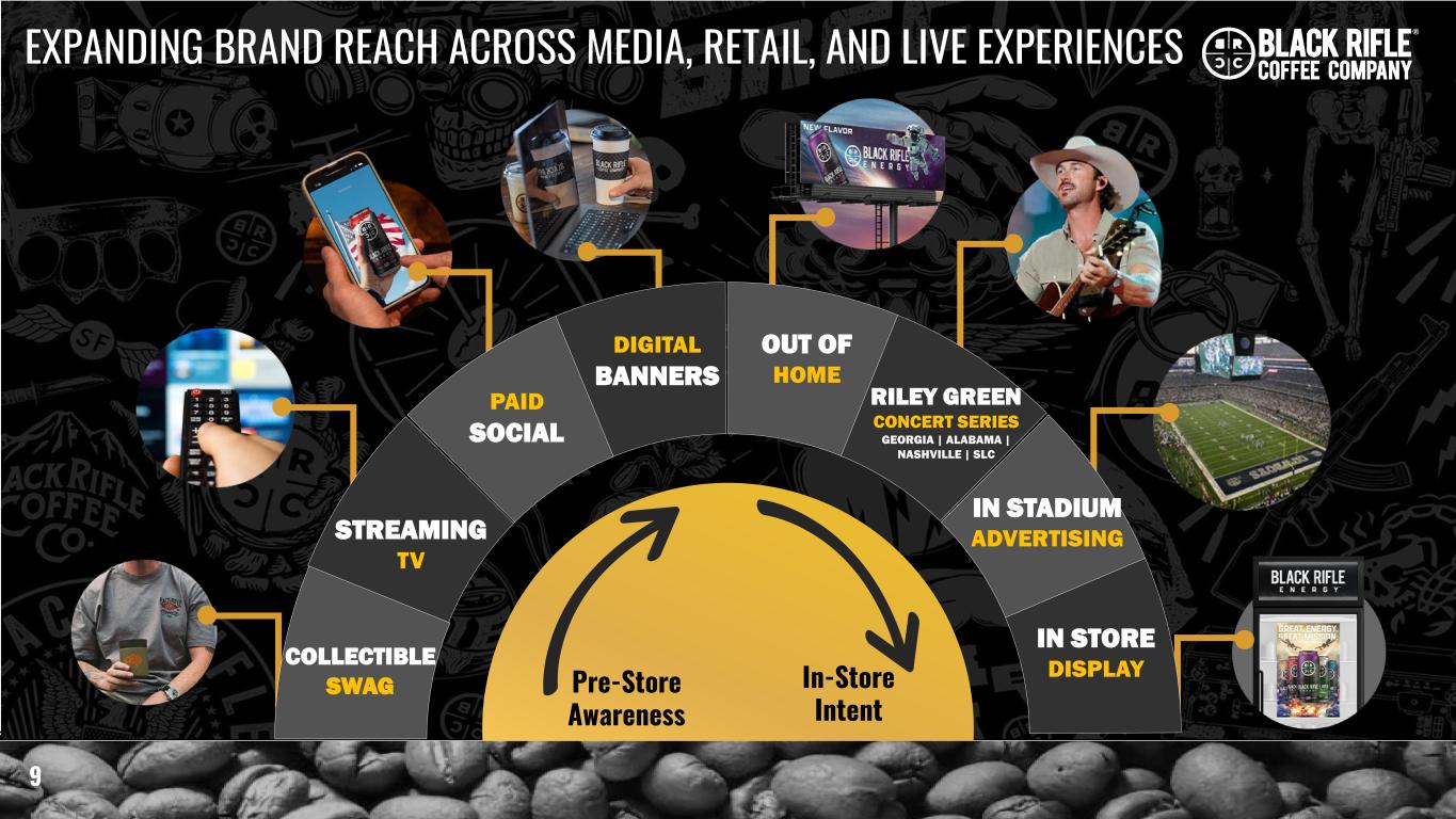 8 MARKETING & BRAND BUILDING PARTNERSHIPS BROADCAST & STREAMING INFLUENCERS/ PARTNERSHIPS DIGITAL/PAID SOCIAL MEDIA RETAIL MEDIA/ LOCATION BASED RETAIL PARTNER AMPLIFICATION National broadcast and streaming presence across SiriusXM, radio, programmatic TV, video spots, and product placement. Tiered partnerships across athletes, veterans, musicians, and cultural icons. Precision targeted digital and paid social media across Meta, TikTok, and YouTube. Targeted OOH and retail media across military bases, Walmart, gas stations, c- stores, and key retail media networks. Advertising and social content that highlight our retail partners.