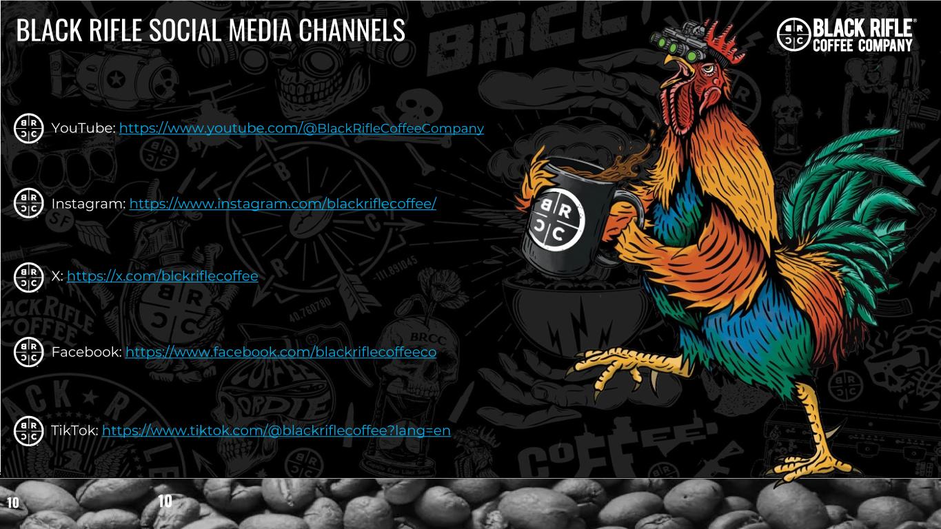 10 BLACK RIFLE SOCIAL MEDIA CHANNELS 10 Instagram: https://www.instagram.com/blackriflecoffee/ X: https://x.com/blckriflecoffee Facebook: https://www.facebook.com/blackriflecoffeeco YouTube: https://www.youtube.com/@BlackRifleCoffeeCompany TikTok: https://www.tiktok.com/@blackriflecoffee?lang=en