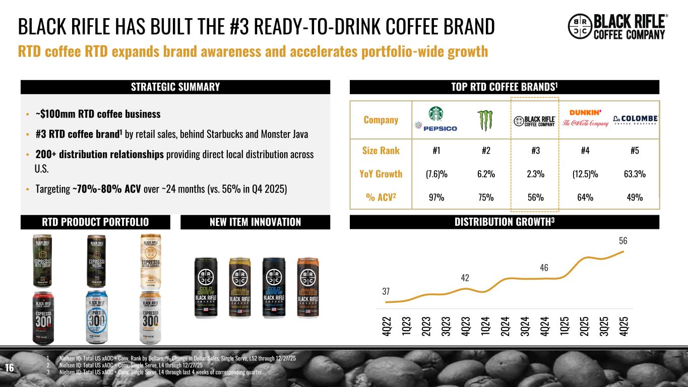 2023 2024 2025 BRCC Category 15 “LAND & EXPAND” STRATEGY IS A PROVEN, SCALABLE GROWTH ENGINE IN PACKAGED COFFEE 1. Nielsen IQ: Total Packaged Coffee, Total US Food & Total US xAOC, 4-Week periods ending closest to each Quarter's end-date 2. Nielsen IQ: Total US Food (Grocery), Units / Item / Store Wks Selling 3. Nielsen IQ: Total US Food (Grocery), Average Items Carried “LAND & EXPAND” GROWTH STRATEGY 24.9 33.4 47.0 54.9 16.8 46.4 48.5 Q1 Q2 Q3 Q4 Q1 Q2 Q3 Q4 Q1 Q2 Q3 Q4 Q1 Q2 Q3 Q4 AC V BRCC xAOC BRCC Grocery 2022 2023 2024 2025 DISTRIBUTION GROWTH1 • Disciplined wholesale growth framework: • Landing new retail banners • Expanding with existing customers by increasing average items carried per store to drive shelf presence • Bagged coffee velocity reached category parity, improving from 23% below category as brand awareness and shelf visibility increased2 • Top 20 brands average 8.9 bag and pod items vs BRCC at 5.73 ~30% ACV expansion in 3 years VELOCITY GAINS2 BRCC Velocity as % of Category 77% 84% 100% BRCC AVERAGE ITEMS CARRIED – GROCERY3 1 2 3 4 5 6 3Q23 4Q23 1Q24 2Q24 3Q24 4Q24 1Q25 2Q25 3Q25 4Q25