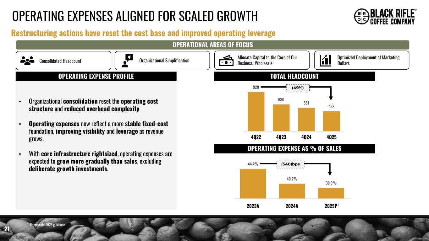 OPERATIONAL PATHWAY TO 40%+ GROSS MARGIN TARGET OPERATIONAL AREAS OF FOCUS Manufacturing ProcessMix Between Channels & Products Distribution and Logistics Sourcing 20 GROSS MARGIN OPTIMIZATION GROSS MARGIN Controllable levers support margin recovery while continuing to invest behind long-term growth What Drove Recent Pressure • Gross margin primarily impacted by variable input costs, including coffee, packaging, and co-man tolling • 2025 margin pressure reflects commodity inflation, tariffs, and planned trade and slotting investments to support wholesale expansion Execution Levers Underway • Pricing discipline, selectively applied by channel • Productivity and efficiency gains across the supply chain • Mix benefits: Portfolio and pack architecture alignment to consumer-led demand trends Path Back to 40%+ Target • Recovery expected to be driven by execution, mix and cost normalization, without reliance on volume assumptions • Identified levers support progressive improvement, even with continued commodity inflation expected into 2026 GREEN COFFEE PRICE ($/lbs)1 1. ICE Futures US, “Coffee C Futures” contract spot rate accessed via Bloomberg Commodity volatility remains elevated, reinforcing focus on controllable levers $2.00 $2.50 $3.00 $3.50 $4.00 Jul -24 Au g-2 4 Se p-2 4 Oc t-2 4 No v-2 4 De c-2 4 Jan -25 Fe b-2 5 Ma r-2 5 Ap r-2 5 Ma y-2 5 Jun -25 Jul -25 Au g-2 5 Se p-2 5 Oc t-2 5 No v-2 5 De c-2 5 42.9% 41.9% 42.1% 38.1% 36.1% 33.9% 36.9% 1Q24 2Q24 3Q24 4Q24 1Q25 2Q25 3Q25 40% Long- Term Gross Margin Target Pricing Discipline
