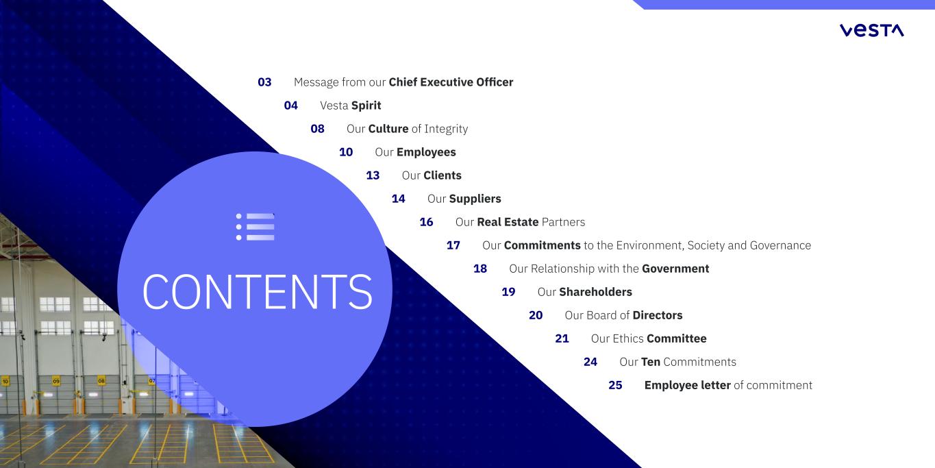 CONTENTS 03 Message from our Chief Executive Officer 04 Vesta Spirit 08 Our Culture of Integrity 10 Our Employees 13 Our Clients 14 Our Suppliers 16 Our Real Estate Partners 17 Our Commitments to the Environment, Society and Governance 18 Our Relationship with the Government 19 Our Shareholders 20 Our Board of Directors 21 Our Ethics Committee 24 Our Ten Commitments 25 Employee letter of commitment