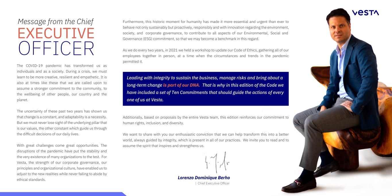 EXECUTIVE OFFICER Message from the Chief Lorenzo Dominique Berho | Chief Executive Officer The COVID-19 pandemic has transformed us as individuals and as a society. During a crisis, we must learn to be more creative, resilient and empathetic. It is also at times like these that we are called upon to assume a stronger commitment to the community, to the wellbeing of other people, our country and the planet. The uncertainty of these past two years has shown us that change is a constant, and adaptability is a necessity. But we must never lose sight of the underlying pillar that is our values, the other constant which guide us through the difficult decisions of our daily lives. With great challenges come great opportunities. The disruptions of the pandemic have put the stability and the very existence of many organizations to the test. For Vesta, the strength of our corporate governance, our principles and organizational culture, have enabled us to adjust to the new realities while never failing to abide by ethical standards. Furthermore, this historic moment for humanity has made it more essential and urgent than ever to behave not only sustainably but proactively, responsibly and with innovation regarding the environment, society, and corporate governance, to contribute to all aspects of our Environmental, Social and Governance (ESG) commitment, so that we may become a benchmark in this regard. As we do every two years, in 2021 we held a workshop to update our Code of Ethics, gathering all of our employees together in person, at a time when the circumstances and trends in the pandemic permitted it. Additionally, based on proposals by the entire Vesta team, this edition reinforces our commitment to human rights, inclusion, and diversity. We want to share with you our enthusiastic conviction that we can help transform this into a better world, always guided by integrity, which is present in all of our practices. We invite you to read and to assume the spirit that inspires and strengthens us. Leading with integrity to sustain the business, manage risks and bring about a long-term change is part of our DNA. That is why in this edition of the Code we have included a set of Ten Commitments that should guide the actions of every one of us at Vesta.