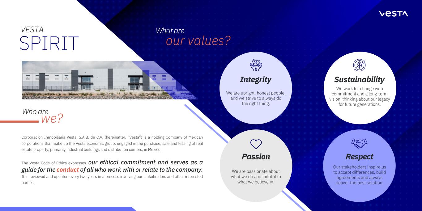 VESTA SPIRIT Who are Corporacion Inmobiliaria Vesta, S.A.B. de C.V. (hereinafter, “Vesta”) is a holding Company of Mexican corporations that make up the Vesta economic group, engaged in the purchase, sale and leasing of real estate property, primarily industrial buildings and distribution centers, in Mexico. The Vesta Code of Ethics expresses our ethical commitment and serves as a guide for the conduct of all who work with or relate to the company. It is reviewed and updated every two years in a process involving our stakeholders and other interested parties. What are our values? we? Sustainability We work for change with commitment and a long-term vision, thinking about our legacy for future generations. Respect Our stakeholders inspire us to accept differences, build agreements and always deliver the best solution. Integrity We are upright, honest people, and we strive to always do the right thing. Passion We are passionate about what we do and faithful to what we believe in.
