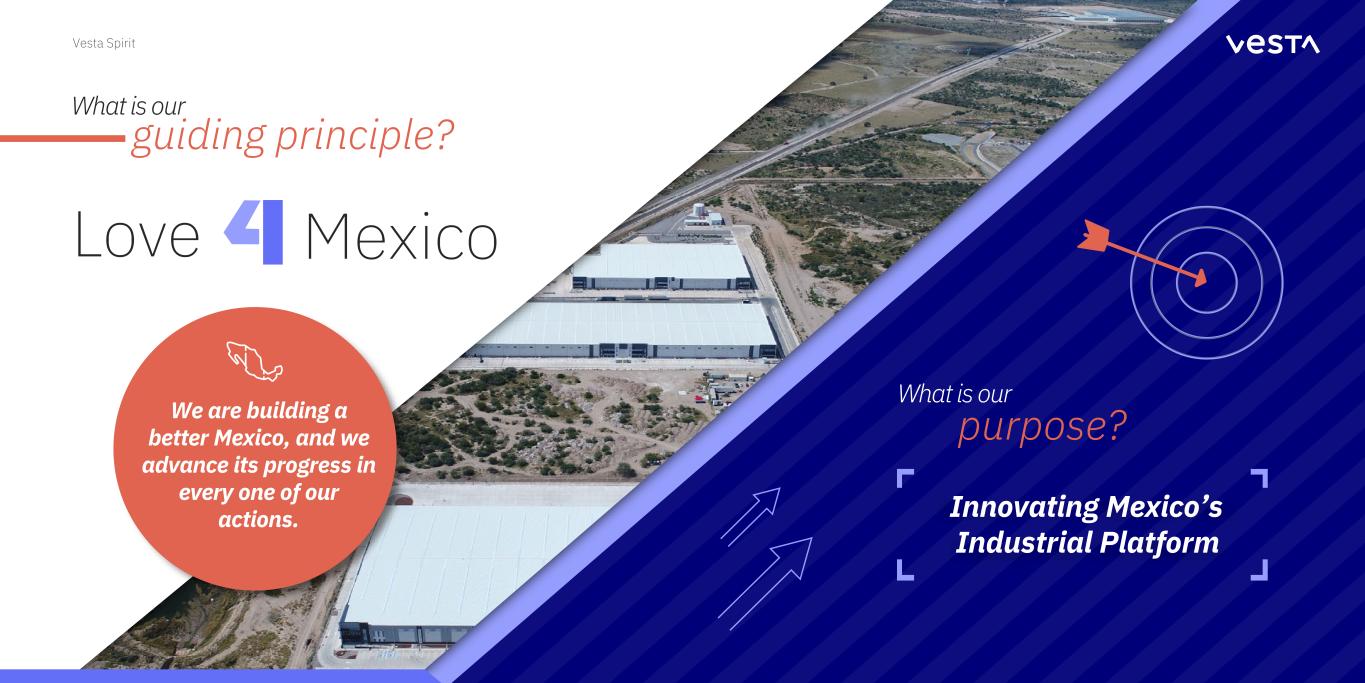 What is our guiding principle? What is our purpose? Vesta Spirit We are building a better Mexico, and we advance its progress in every one of our actions. MexicoLove Innovating Mexico’s Industrial Platform