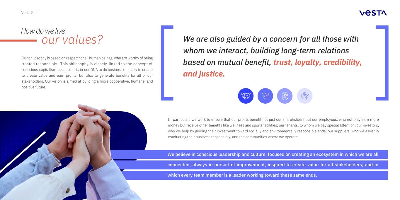 How do we live our values? We are also guided by a concern for all those with whom we interact, building long-term relations based on mutual benefit, trust, loyalty, credibility, and justice. Vesta Spirit Our philosophy is based on respect for all human beings, who are worthy of being treated responsibly. This philosophy is closely linked to the concept of conscious capitalism because it is in our DNA to do business ethically to create to create value and earn profits, but also to generate benefits for all of our stakeholders. Our vision is aimed at building a more cooperative, humane, and positive future. In particular, we work to ensure that our profits benefit not just our shareholders but our employees, who not only earn more money but receive other benefits like wellness and sports facilities; our tenants, to whom we pay special attention; our investors, who we help by guiding their investment toward socially and environmentally responsible ends; our suppliers, who we assist in conducting their business responsibly, and the communities where we operate. We believe in conscious leadership and culture, focused on creating an ecosystem in which we are all connected, always in pursuit of improvement, inspired to create value for all stakeholders, and in which every team member is a leader working toward these same ends.