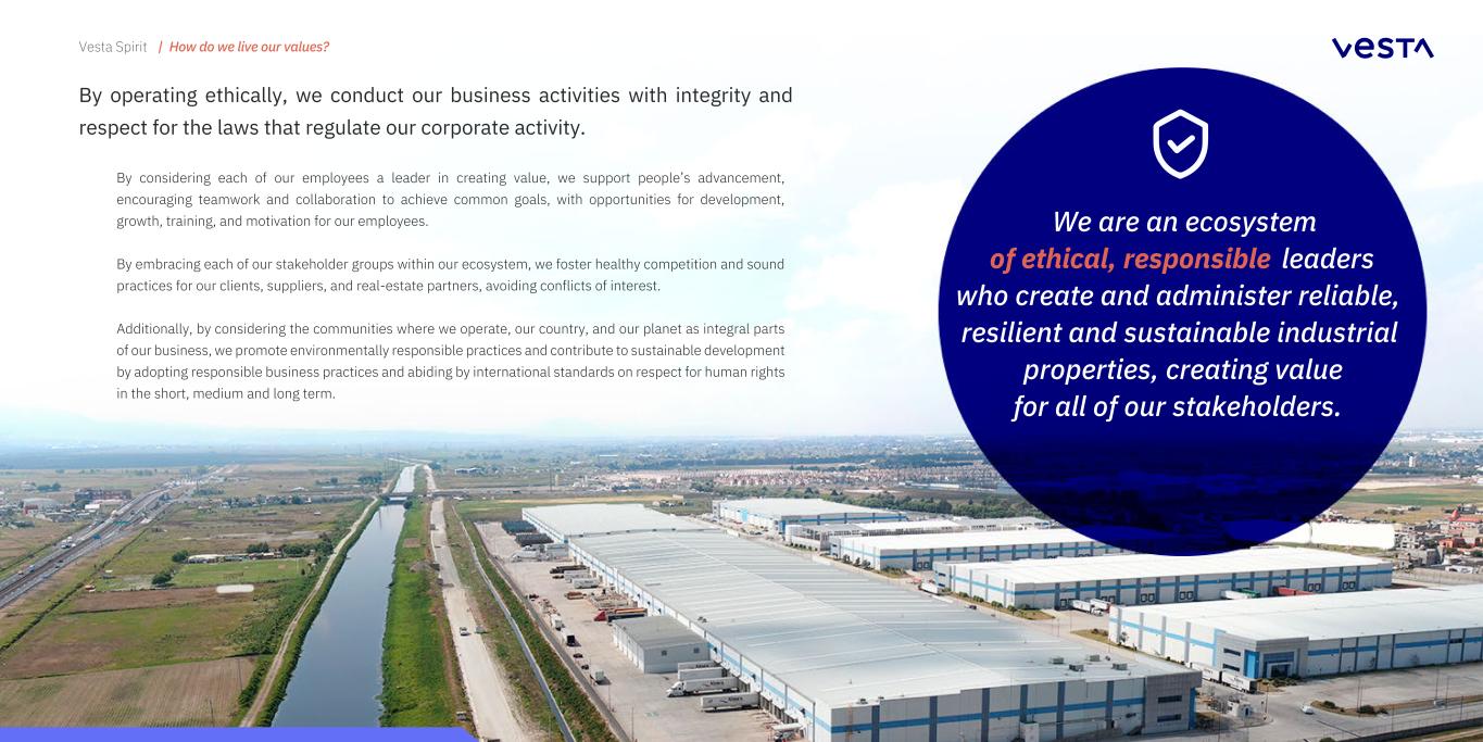 Vesta Spirit | How do we live our values? We are an ecosystem of ethical, responsible leaders who create and administer reliable, resilient and sustainable industrial properties, creating value for all of our stakeholders. By operating ethically, we conduct our business activities with integrity and respect for the laws that regulate our corporate activity. By considering each of our employees a leader in creating value, we support people’s advancement, encouraging teamwork and collaboration to achieve common goals, with opportunities for development, growth, training, and motivation for our employees. By embracing each of our stakeholder groups within our ecosystem, we foster healthy competition and sound practices for our clients, suppliers, and real-estate partners, avoiding conflicts of interest. Additionally, by considering the communities where we operate, our country, and our planet as integral parts of our business, we promote environmentally responsible practices and contribute to sustainable development by adopting responsible business practices and abiding by international standards on respect for human rights in the short, medium and long term.