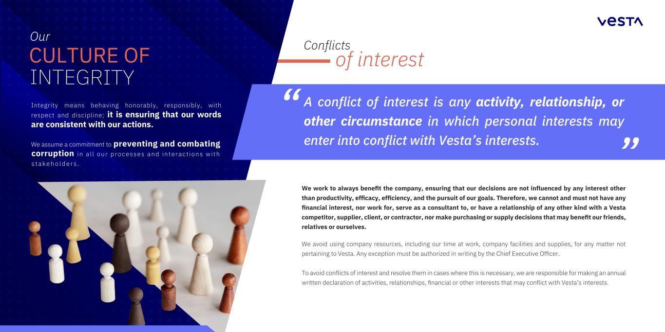 We work to always benefit the company, ensuring that our decisions are not influenced by any interest other than productivity, efficacy, efficiency, and the pursuit of our goals. Therefore, we cannot and must not have any financial interest, nor work for, serve as a consultant to, or have a relationship of any other kind with a Vesta competitor, supplier, client, or contractor, nor make purchasing or supply decisions that may benefit our friends, relatives or ourselves. We avoid using company resources, including our time at work, company facilities and supplies, for any matter not pertaining to Vesta. Any exception must be authorized in writing by the Chief Executive Officer. To avoid conflicts of interest and resolve them in cases where this is necessary, we are responsible for making an annual written declaration of activities, relationships, financial or other interests that may conflict with Vesta’s interests. CULTURE OF INTEGRITY Our Conflicts of interest Integrity means behaving honorably, responsibly, with respect and discipline; it is ensuring that our words are consistent with our actions. We assume a commitment to preventing and combating corruption i n a l l o u r p r o c e s s e s a n d i n t e r a c t i o n s w i t h s t a k e h o l d e r s . A conflict of interest is any activity, relationship, or other circumstance in which personal interests may enter into conflict with Vesta’s interests.