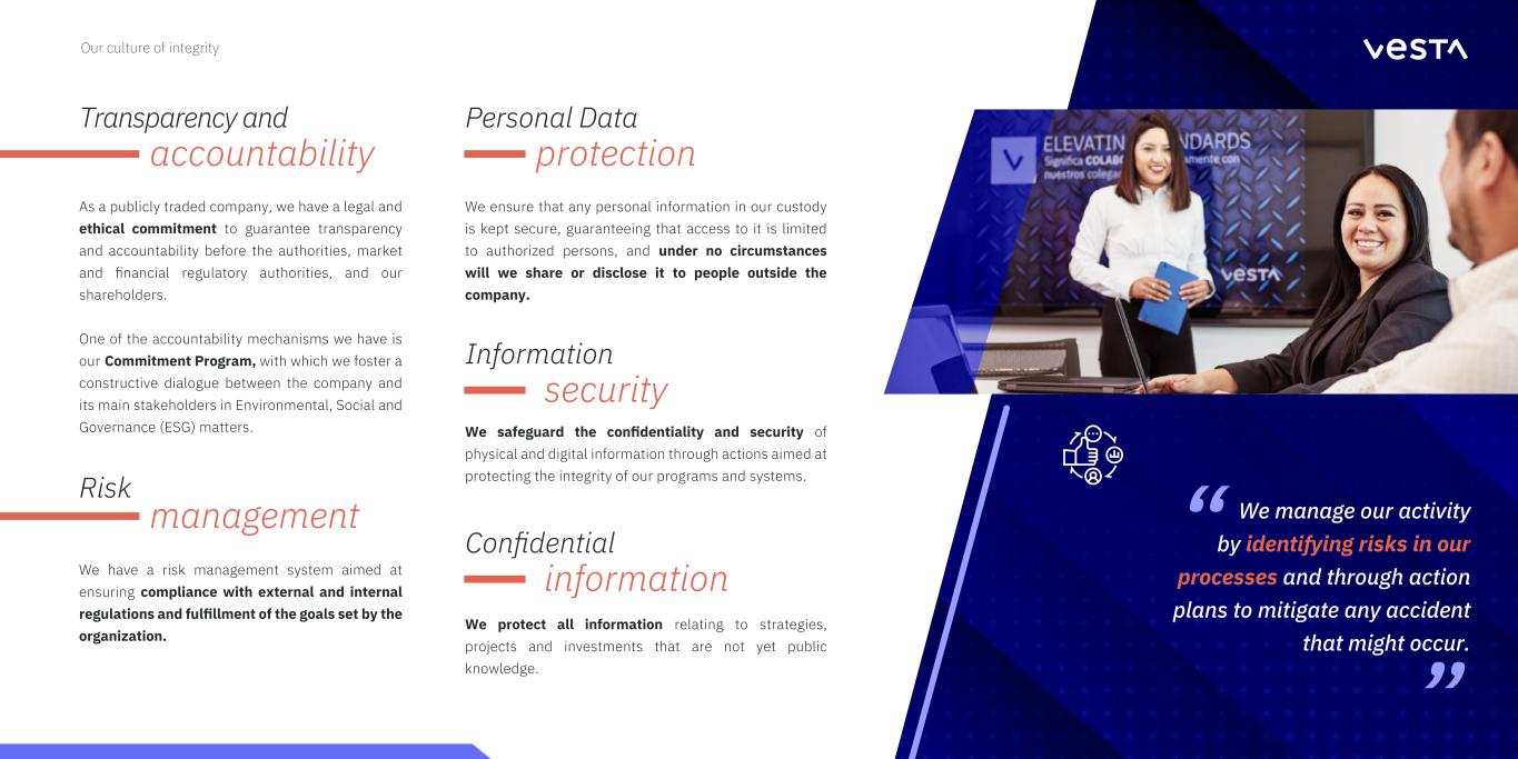 Transparency and accountability Risk management Personal Data protection Information security Confidential information Our culture of integrity As a publicly traded company, we have a legal and ethical commitment to guarantee transparency and accountability before the authorities, market and financial regulatory authorities, and our shareholders. One of the accountability mechanisms we have is our Commitment Program, with which we foster a constructive dialogue between the company and its main stakeholders in Environmental, Social and Governance (ESG) matters. We ensure that any personal information in our custody is kept secure, guaranteeing that access to it is limited to authorized persons, and under no circumstances will we share or disclose it to people outside the company. We safeguard the confidentiality and security of physical and digital information through actions aimed at protecting the integrity of our programs and systems. We protect all information relating to strategies, projects and investments that are not yet public knowledge. We have a risk management system aimed at ensuring compliance with external and internal regulations and fulfillment of the goals set by the organization. We manage our activity by identifying risks in our processes and through action plans to mitigate any accident that might occur.