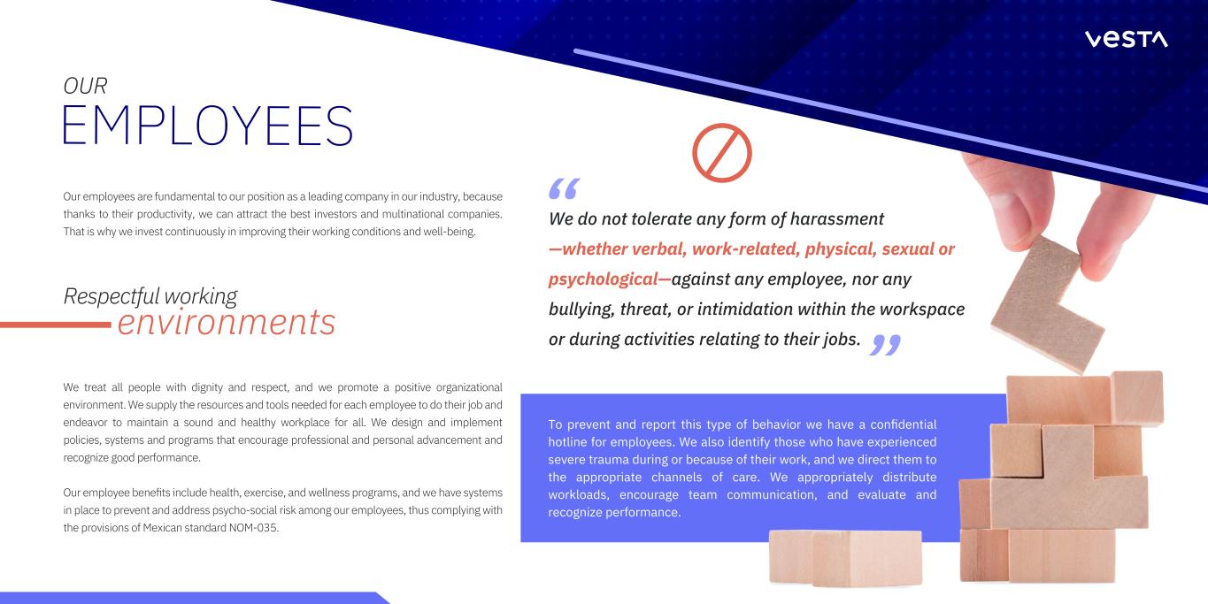 OUR EMPLOYEES Respectful working environments We do not tolerate any form of harassment —whether verbal, work-related, physical, sexual or psychological—against any employee, nor any bullying, threat, or intimidation within the workspace or during activities relating to their jobs. Our employees are fundamental to our position as a leading company in our industry, because thanks to their productivity, we can attract the best investors and multinational companies. That is why we invest continuously in improving their working conditions and well-being. To prevent and report this type of behavior we have a confidential hotline for employees. We also identify those who have experienced severe trauma during or because of their work, and we direct them to the appropriate channels of care. We appropriately distribute workloads, encourage team communication, and evaluate and recognize performance. We treat all people with dignity and respect, and we promote a positive organizational environment. We supply the resources and tools needed for each employee to do their job and endeavor to maintain a sound and healthy workplace for all. We design and implement policies, systems and programs that encourage professional and personal advancement and recognize good performance. Our employee benefits include health, exercise, and wellness programs, and we have systems in place to prevent and address psycho-social risk among our employees, thus complying with the provisions of Mexican standard NOM-035.