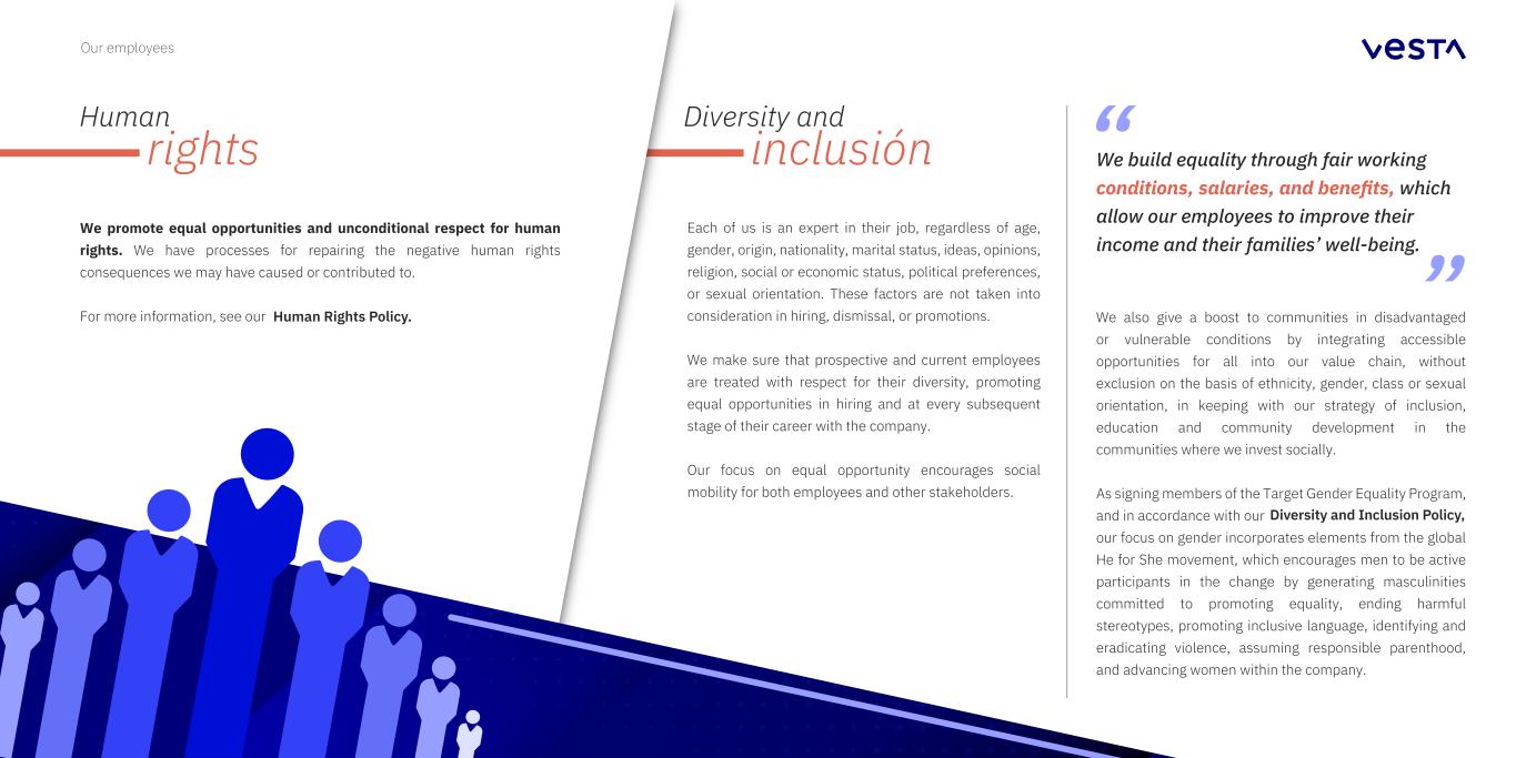 Diversity and inclusión Human rights Our employees We build equality through fair working conditions, salaries, and benefits, which allow our employees to improve their income and their families’ well-being. We promote equal opportunities and unconditional respect for human rights. We have processes for repairing the negative human rights consequences we may have caused or contributed to. For more information, see our http://vesta.com.mx/misc/pdfs/HumanRightsPolicy.pdf Each of us is an expert in their job, regardless of age, gender, origin, nationality, marital status, ideas, opinions, religion, social or economic status, political preferences, or sexual orientation. These factors are not taken into consideration in hiring, dismissal, or promotions. We make sure that prospective and current employees are treated with respect for their diversity, promoting equal opportunities in hiring and at every subsequent stage of their career with the company. Our focus on equal opportunity encourages social mobility for both employees and other stakeholders. We also give a boost to communities in disadvantaged or vulnerable conditions by integrating accessible opportunities for all into our value chain, without exclusion on the basis of ethnicity, gender, class or sexual orientation, in keeping with our strategy of inclusion, education and community development in the communities where we invest socially. As signing members of the Target Gender Equality Program, and in accordance with our our focus on gender incorporates elements from the global He for She movement, which encourages men to be active participants in the change by generating masculinities committed to promoting equality, ending harmful stereotypes, promoting inclusive language, identifying and eradicating violence, assuming responsible parenthood, and advancing women within the company. Diversity and Inclusion Policy, Human Rights Policy.