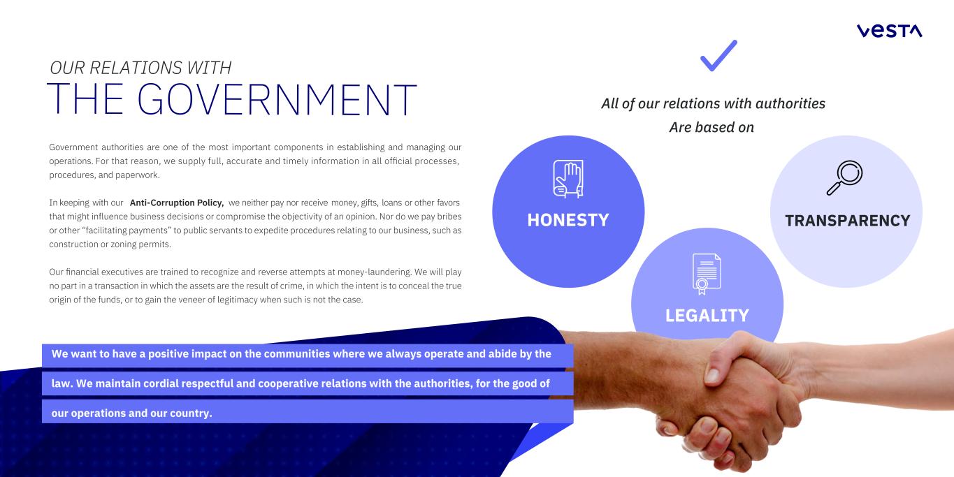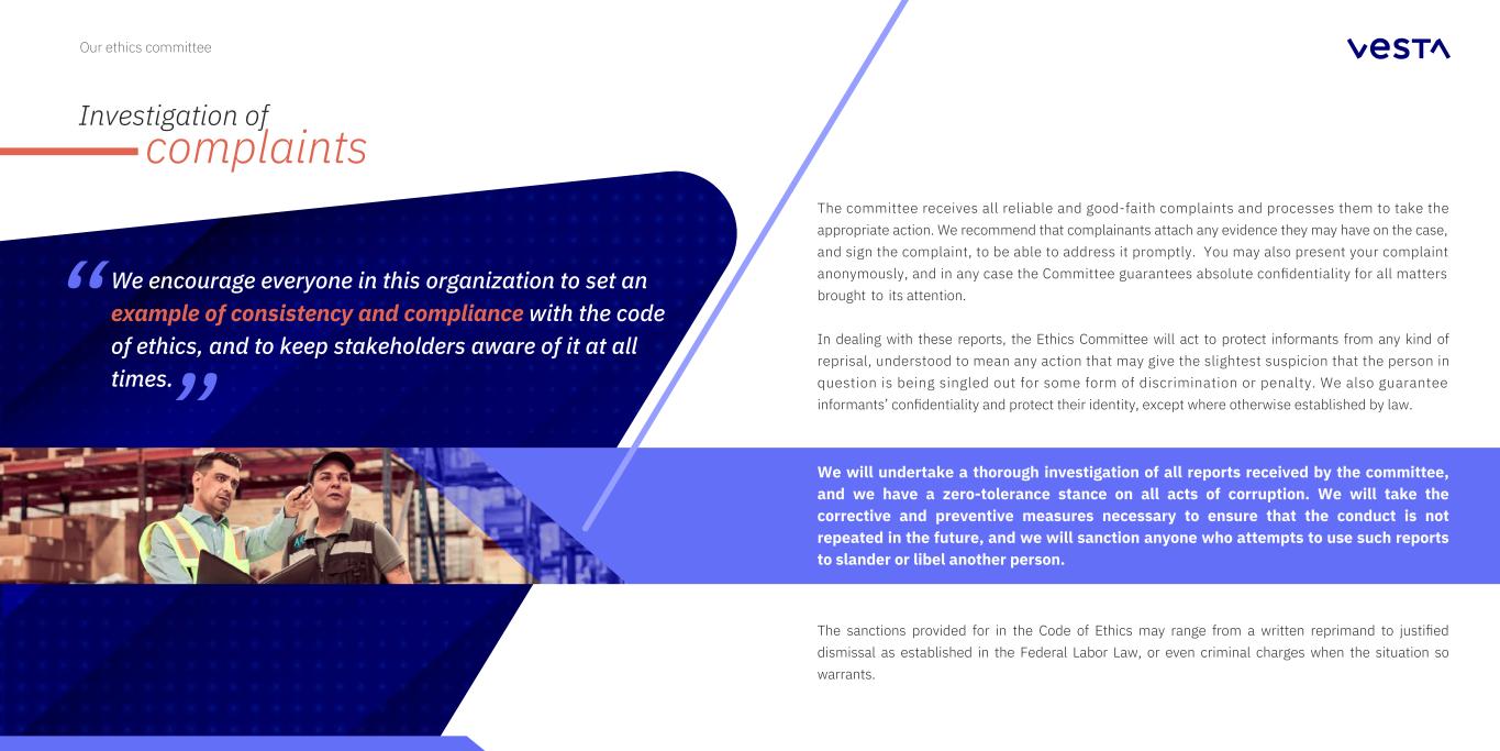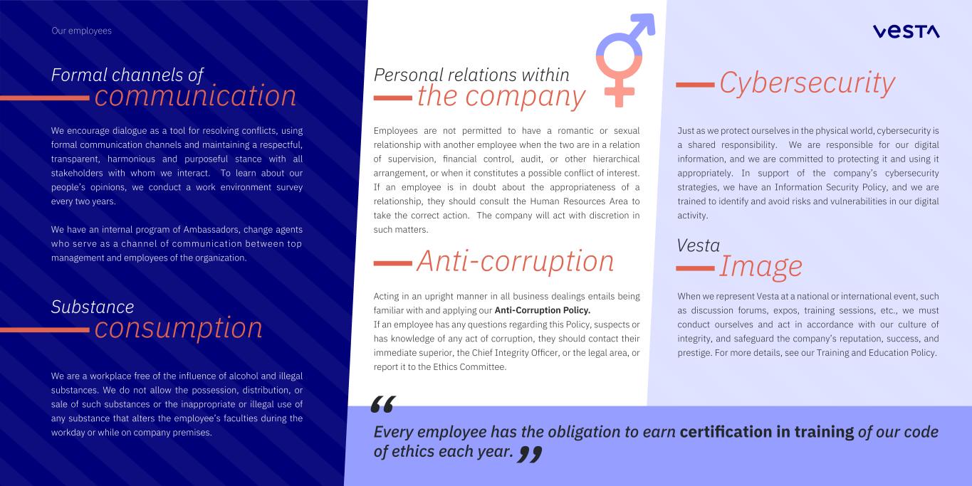 Formal channels of communication Substance consumption Personal relations within Vesta ImageAnti-corruption Cybersecurity Our employees Every employee has the obligation to earn certification in training of our code of ethics each year. We encourage dialogue as a tool for resolving conflicts, using formal communication channels and maintaining a respectful, transparent, harmonious and purposeful stance with all stakeholders with whom we interact. To learn about our people’s opinions, we conduct a work environment survey every two years. We have an internal program of Ambassadors, change agents who serve as a channel of communication between top management and employees of the organization. Employees are not permitted to have a romantic or sexual relationship with another employee when the two are in a relation of supervision, financial control, audit, or other hierarchical arrangement, or when it constitutes a possible conflict of interest. If an employee is in doubt about the appropriateness of a relationship, they should consult the Human Resources Area to take the correct action. The company will act with discretion in such matters. Just as we protect ourselves in the physical world, cybersecurity is a shared responsibility. We are responsible for our digital information, and we are committed to protecting it and using it appropriately. In support of the company’s cybersecurity strategies, we have an Information Security Policy, and we are trained to identify and avoid risks and vulnerabilities in our digital activity. When we represent Vesta at a national or international event, such as discussion forums, expos, training sessions, etc., we must conduct ourselves and act in accordance with our culture of integrity, and safeguard the company’s reputation, success, and prestige. For more details, see our Training and Education Policy. Acting in an upright manner in all business dealings entails being familiar with and applying our If an employee has any questions regarding this Policy, suspects or has knowledge of any act of corruption, they should contact their immediate superior, the Chief Integrity Officer, or the legal area, or report it to the Ethics Committee. We are a workplace free of the influence of alcohol and illegal substances. We do not allow the possession, distribution, or sale of such substances or the inappropriate or illegal use of any substance that alters the employee’s faculties during the workday or while on company premises. the company Anti-Corruption Policy.