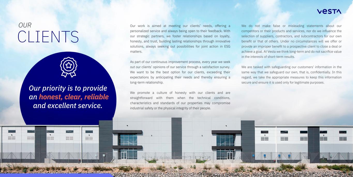 OUR CLIENTS Our priority is to provide an honest, clear, reliable and excellent service. Our work is aimed at meeting our clients’ needs, offering a personalized service and always being open to their feedback. With our strategic partners, we foster relationships based on loyalty, honesty, and trust, building lasting relationships through innovative solutions, always seeking out possibilities for joint action in ESG matters. As part of our continuous improvement process, every year we seek out our clients’ opinions of our service through a satisfaction survey. We want to be the best option for our clients, exceeding their expectations by anticipating their needs and thereby ensuring a long-term relationship. We promote a culture of honesty with our clients and are straightforward with them when the technical conditions, characteristics and standards of our properties may compromise industrial safety or the physical integrity of their people. We do not make false or misleading statements about our competitors or their products and services, nor do we influence the selection of suppliers, contractors, and subcontractors for our own benefit or that of others. Under no circumstances will we offer or provide an improper benefit to a prospective client to close a deal or achieve a goal. At Vesta we think long-term and do not sacrifice value in the interests of short-term results. We are tasked with safeguarding our customers' information in the same way that we safeguard our own, that is, confidentially. In this regard, we take the appropriate measures to keep this information secure and ensure it is used only for legitimate purposes.