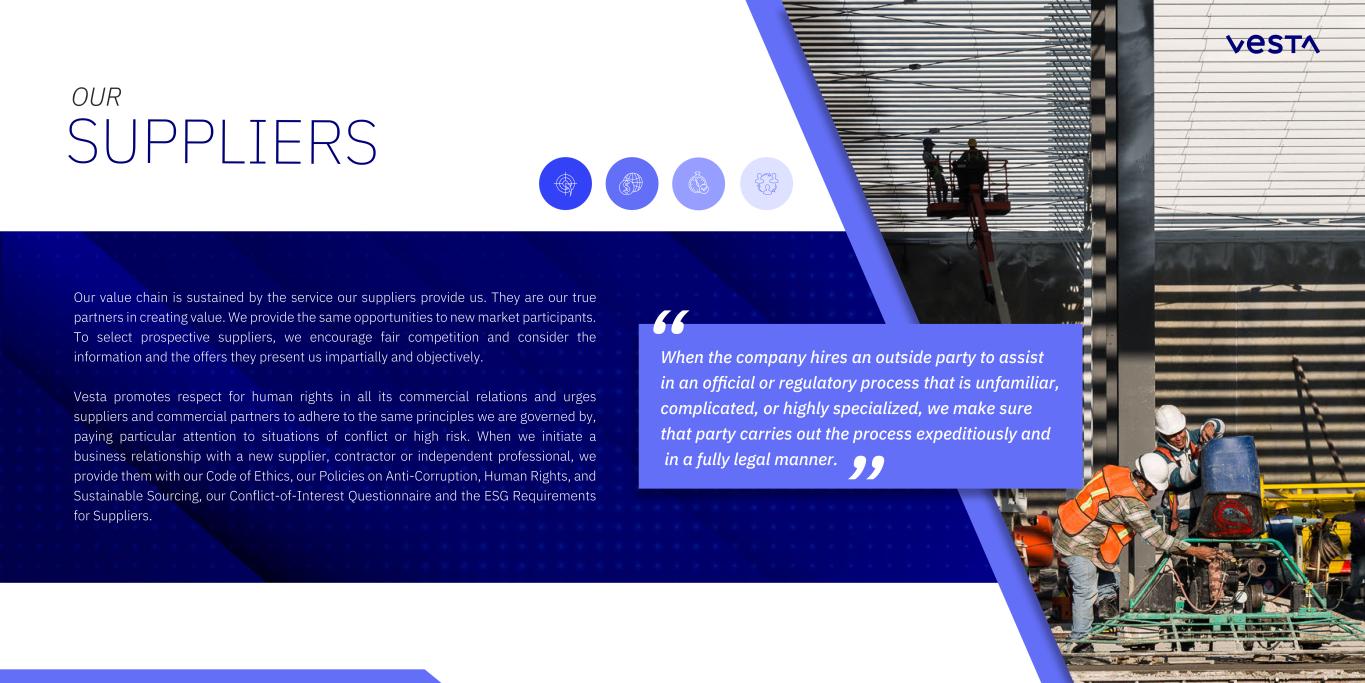 OUR SUPPLIERS When the company hires an outside party to assist in an official or regulatory process that is unfamiliar, complicated, or highly specialized, we make sure that party carries out the process expeditiously and in a fully legal manner. Our value chain is sustained by the service our suppliers provide us. They are our true partners in creating value. We provide the same opportunities to new market participants. To select prospective suppliers, we encourage fair competition and consider the information and the offers they present us impartially and objectively. Vesta promotes respect for human rights in all its commercial relations and urges suppliers and commercial partners to adhere to the same principles we are governed by, paying particular attention to situations of conflict or high risk. When we initiate a business relationship with a new supplier, contractor or independent professional, we provide them with our Code of Ethics, our Policies on Anti-Corruption, Human Rights, and Sustainable Sourcing, our Conflict-of-Interest Questionnaire and the ESG Requirements for Suppliers.
