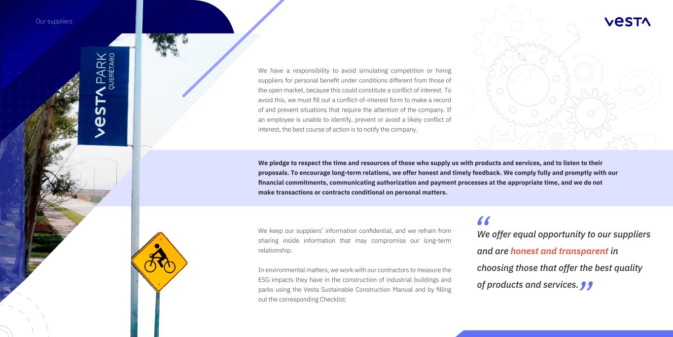 Our suppliers We offer equal opportunity to our suppliers and are honest and transparent in choosing those that offer the best quality of products and services. “ ” We have a responsibility to avoid simulating competition or hiring suppliers for personal benefit under conditions different from those of the open market, because this could constitute a conflict of interest. To avoid this, we must fill out a conflict-of-interest form to make a record of and prevent situations that require the attention of the company. If an employee is unable to identify, prevent or avoid a likely conflict of interest, the best course of action is to notify the company. We keep our suppliers’ information confidential, and we refrain from sharing inside information that may compromise our long-term relationship. In environmental matters, we work with our contractors to measure the ESG impacts they have in the construction of industrial buildings and parks using the Vesta Sustainable Construction Manual and by filling out the corresponding Checklist. We pledge to respect the time and resources of those who supply us with products and services, and to listen to their proposals. To encourage long-term relations, we offer honest and timely feedback. We comply fully and promptly with our financial commitments, communicating authorization and payment processes at the appropriate time, and we do not make transactions or contracts conditional on personal matters.