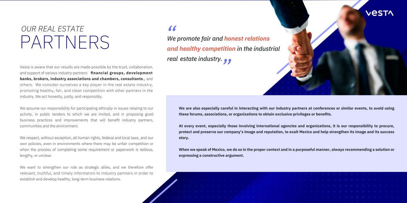 Vesta is aware that our results are made possible by the trust, collaboration, and support of various industry partners: financial groups, development banks, brokers, industry associations and chambers, consultants , and others. We consider ourselves a key player in the real estate industry, promoting healthy, fair, and clean competition with other partners in the industry. We act honestly, justly, and responsibly. We assume our responsibility for participating ethically in issues relating to our activity, in public tenders to which we are invited, and in proposing good business practices and improvements that will benefit industry partners, communities and the environment. We respect, without exception, all human rights, federal and local laws, and our own policies, even in environments where there may be unfair competition or when the process of completing some requirement or paperwork is tedious, lengthy, or unclear. We want to strengthen our role as strategic allies, and we therefore offer relevant, truthful, and timely information to industry partners in order to establish and develop healthy, long-term business relations. OUR REAL ESTATE PARTNERS We are also especially careful in interacting with our industry partners at conferences or similar events, to avoid using these forums, associations, or organizations to obtain exclusive privileges or benefits. At every event, especially those involving international agencies and organizations, it is our responsibility to procure, protect and preserve our company’s image and reputation, to exalt Mexico and help strengthen its image and its success story. When we speak of Mexico, we do so in the proper context and in a purposeful manner, always recommending a solution or expressing a constructive argument. “ ” We promote fair and honest relations and healthy competition in the industrial real estate industry.