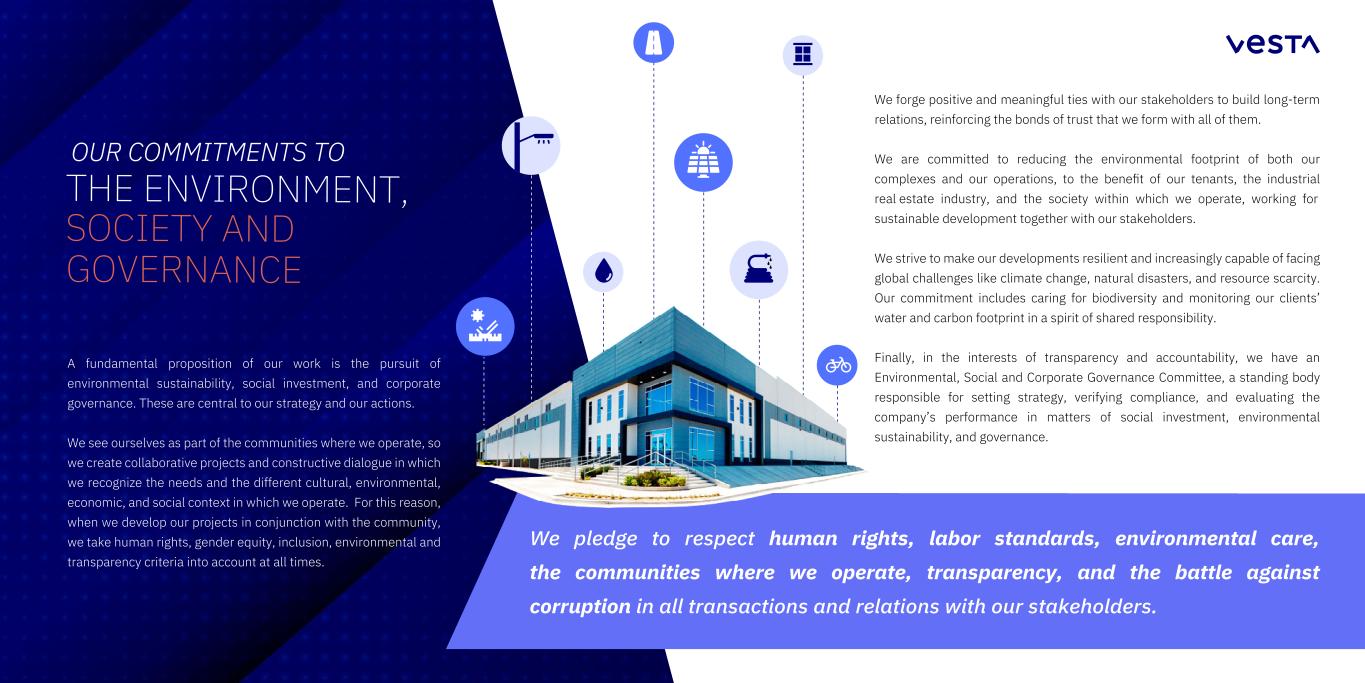OUR COMMITMENTS TO THE ENVIRONMENT, SOCIETY AND GOVERNANCE A fundamental proposition of our work is the pursuit of environmental sustainability, social investment, and corporate governance. These are central to our strategy and our actions. We see ourselves as part of the communities where we operate, so we create collaborative projects and constructive dialogue in which we recognize the needs and the different cultural, environmental, economic, and social context in which we operate. For this reason, when we develop our projects in conjunction with the community, we take human rights, gender equity, inclusion, environmental and transparency criteria into account at all times. We forge positive and meaningful ties with our stakeholders to build long-term relations, reinforcing the bonds of trust that we form with all of them. We are committed to reducing the environmental footprint of both our complexes and our operations, to the benefit of our tenants, the industrial real estate industry, and the society within which we operate, working for sustainable development together with our stakeholders. We strive to make our developments resilient and increasingly capable of facing global challenges like climate change, natural disasters, and resource scarcity. Our commitment includes caring for biodiversity and monitoring our clients’ water and carbon footprint in a spirit of shared responsibility. Finally, in the interests of transparency and accountability, we have an Environmental, Social and Corporate Governance Committee, a standing body responsible for setting strategy, verifying compliance, and evaluating the company’s performance in matters of social investment, environmental sustainability, and governance. We pledge to respect human rights, labor standards, environmental care, the communities where we operate, transparency, and the battle against corruption in all transactions and relations with our stakeholders.