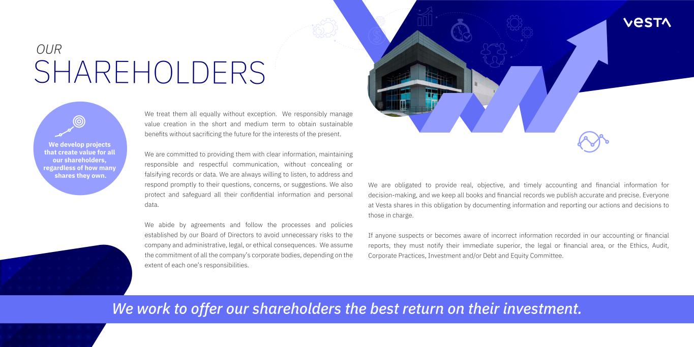 OUR SHAREHOLDERS We work to offer our shareholders the best return on their investment. We develop projects that create value for all our shareholders, regardless of how many shares they own. We treat them all equally without exception. We responsibly manage value creation in the short and medium term to obtain sustainable benefits without sacrificing the future for the interests of the present. We are committed to providing them with clear information, maintaining responsible and respectful communication, without concealing or falsifying records or data. We are always willing to listen, to address and respond promptly to their questions, concerns, or suggestions. We also protect and safeguard all their confidential information and personal data. We abide by agreements and follow the processes and policies established by our Board of Directors to avoid unnecessary risks to the company and administrative, legal, or ethical consequences. We assume the commitment of all the company’s corporate bodies, depending on the extent of each one’s responsibilities. We are obligated to provide real, objective, and timely accounting and financial information for decision-making, and we keep all books and financial records we publish accurate and precise. Everyone at Vesta shares in this obligation by documenting information and reporting our actions and decisions to those in charge. If anyone suspects or becomes aware of incorrect information recorded in our accounting or financial reports, they must notify their immediate superior, the legal or financial area, or the Ethics, Audit, Corporate Practices, Investment and/or Debt and Equity Committee.