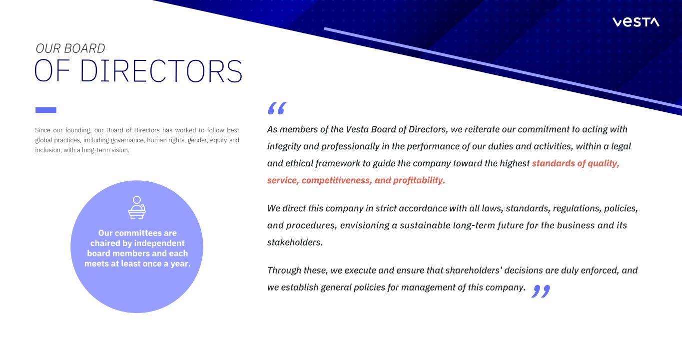 OUR BOARD OF DIRECTORS Our committees are chaired by independent board members and each meets at least once a year. Since our founding, our Board of Directors has worked to follow best global practices, including governance, human rights, gender, equity and inclusion, with a long-term vision. As members of the Vesta Board of Directors, we reiterate our commitment to acting with integrity and professionally in the performance of our duties and activities, within a legal and ethical framework to guide the company toward the highest standards of quality, service, competitiveness, and profitability. We direct this company in strict accordance with all laws, standards, regulations, policies, and procedures, envisioning a sustainable long-term future for the business and its stakeholders. Through these, we execute and ensure that shareholders’ decisions are duly enforced, and we establish general policies for management of this company.