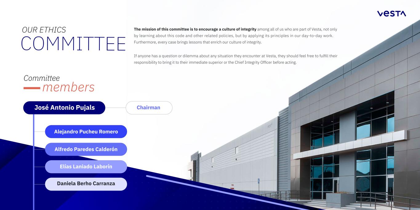 OUR ETHICS COMMITTEE Committee members José Antonio Pujals Alejandro Pucheu Romero Alfredo Paredes Calderón Elías Laniado Laborín Daniela Berho Carranza Chairman The mission of this committee is to encourage a culture of integrity among all of us who are part of Vesta, not only by learning about this code and other related policies, but by applying its principles in our day-to-day work. Furthermore, every case brings lessons that enrich our culture of integrity. If anyone has a question or dilemma about any situation they encounter at Vesta, they should feel free to fulfill their responsibility to bring it to their immediate superior or the Chief Integrity Officer before acting.