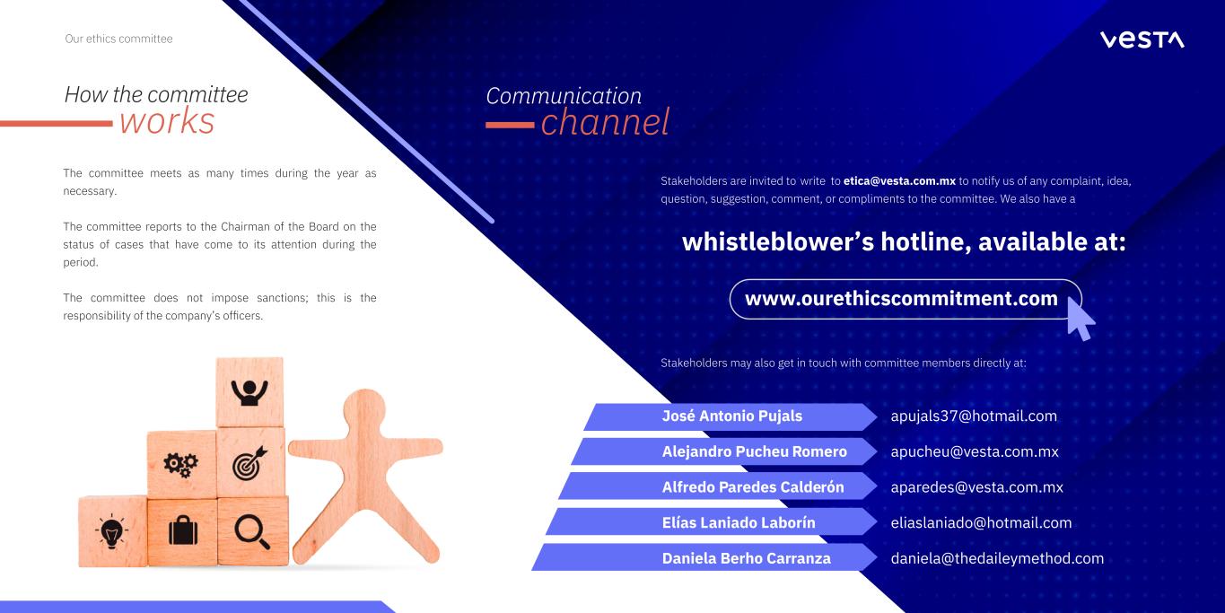 Communication channel How the committee works Our ethics committee whistleblower’s hotline, available at: José Antonio Pujals Alejandro Pucheu Romero Alfredo Paredes Calderón Elías Laniado Laborín Daniela Berho Carranza apujals37@hotmail.com apucheu@vesta.com.mx aparedes@vesta.com.mx eliaslaniado@hotmail.com daniela@thedaileymethod.com The committee meets as many times during the year as necessary. The committee reports to the Chairman of the Board on the status of cases that have come to its attention during the period. The committee does not impose sanctions; this is the responsibility of the company’s officers. Stakeholders are invited to write to etica@vesta.com.mx to notify us of any complaint, idea, question, suggestion, comment, or compliments to the committee. We also have a Stakeholders may also get in touch with committee members directly at: www.ourethicscommitment.com