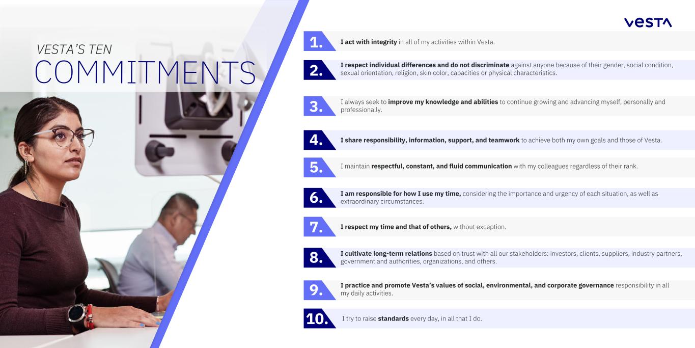 VESTA’S TEN COMMITMENTS I act with integrity in all of my activities within Vesta. I respect individual differences and do not discriminate against anyone because of their gender, social condition, sexual orientation, religion, skin color, capacities or physical characteristics. I always seek to improve my knowledge and abilities to continue growing and advancing myself, personally and professionally. I share responsibility, information, support, and teamwork to achieve both my own goals and those of Vesta. I maintain respectful, constant, and fluid communication with my colleagues regardless of their rank. I am responsible for how I use my time, considering the importance and urgency of each situation, as well as extraordinary circumstances. I respect my time and that of others, without exception. I cultivate long-term relations based on trust with all our stakeholders: investors, clients, suppliers, industry partners, government and authorities, organizations, and others. I practice and promote Vesta’s values of social, environmental, and corporate governance responsibility in all my daily activities. I try to raise standards every day, in all that I do. 1. 2. 3. 4. 5. 6. 7. 8. 9. 10.