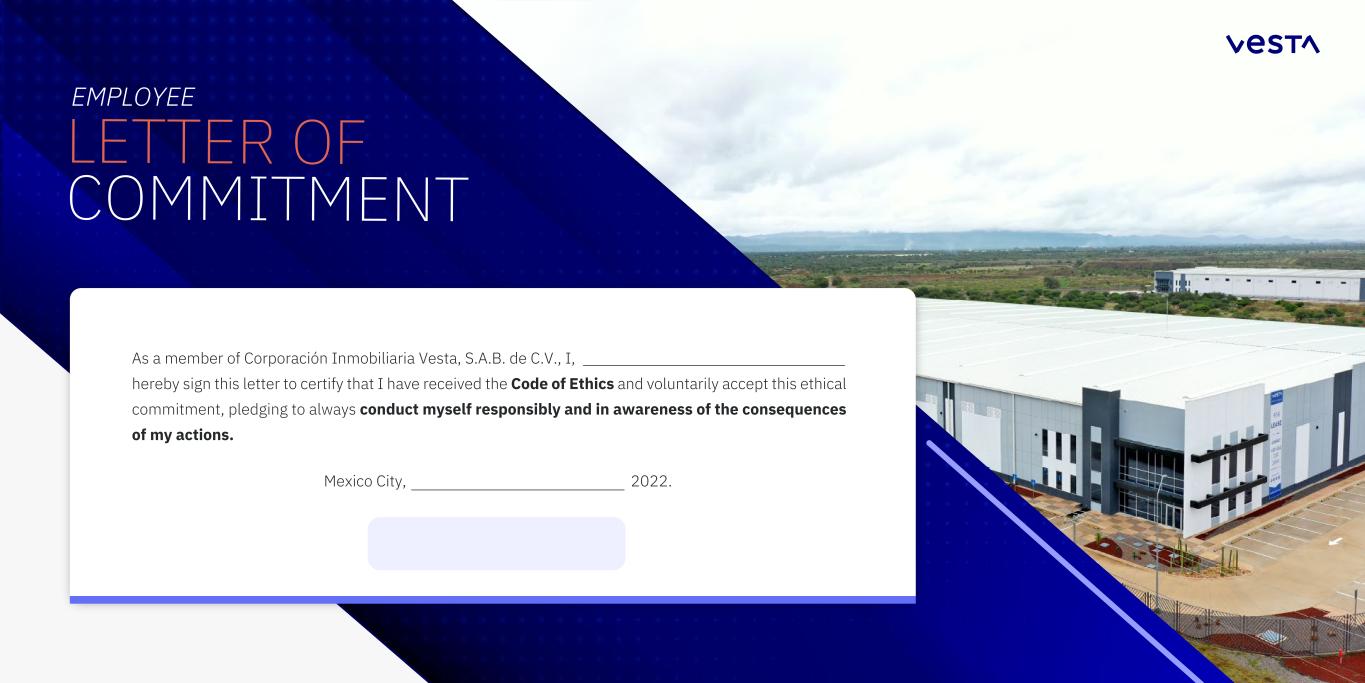 EMPLOYEE LETTER OF COMMITMENT Mexico City, 2022. As a member of Corporación Inmobiliaria Vesta, S.A.B. de C.V., I, hereby sign this letter to certify that I have received the Code of Ethics and voluntarily accept this ethical commitment, pledging to always conduct myself responsibly and in awareness of the consequences of my actions.