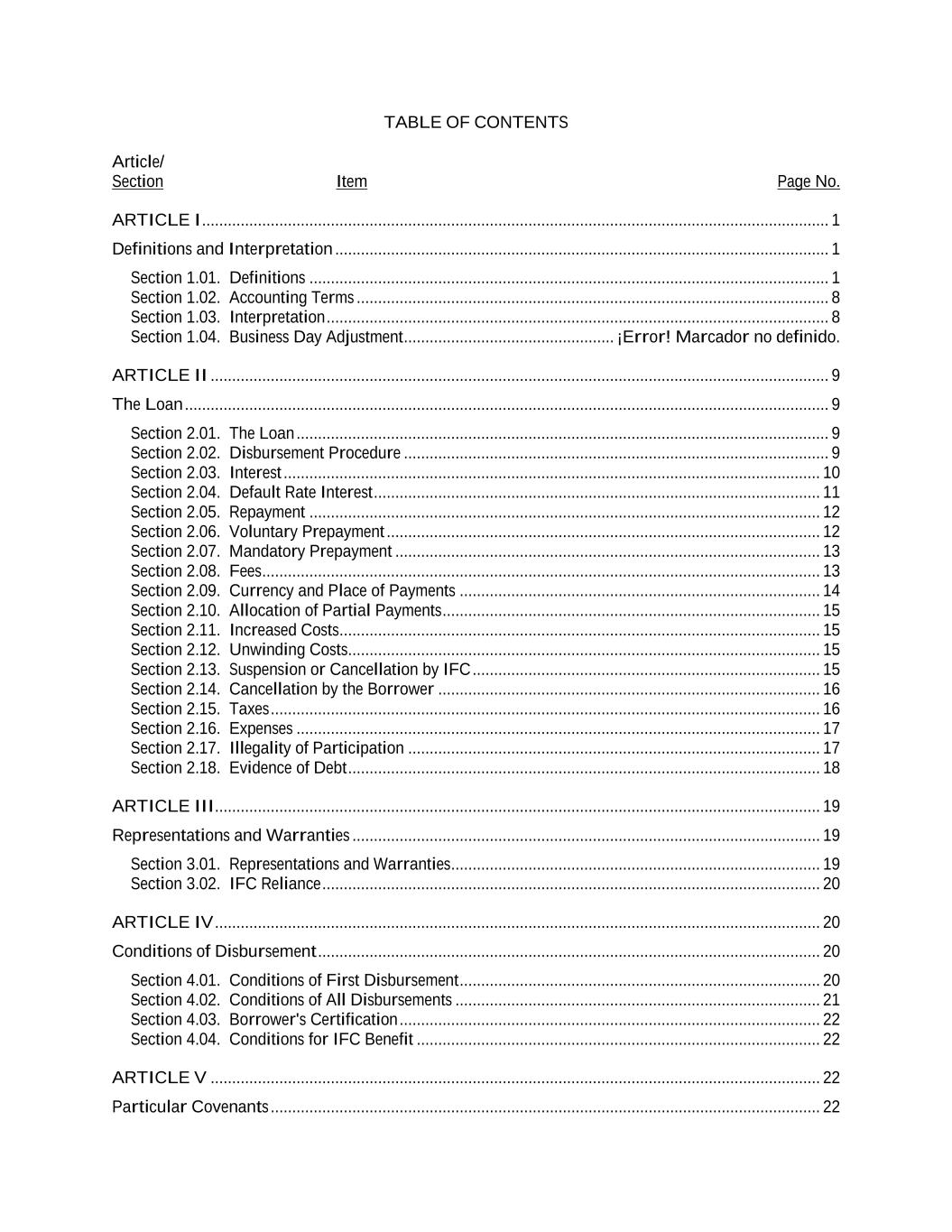 TABLE OF CONTENTS Article/ Section Item Page No. ARTICLE I .................................................................................................................................................. 1 Definitions and Interpretation ................................................................................................................... 1 Section 1.01. Definitions ......................................................................................................................... 1 Section 1.02. Accounting Terms .............................................................................................................. 8 Section 1.03. Interpretation ..................................................................................................................... 8 Section 1.04. Business Day Adjustment ................................................. ¡Error! Marcador no definido. ARTICLE II ................................................................................................................................................ 9 The Loan ...................................................................................................................................................... 9 Section 2.01. The Loan ............................................................................................................................ 9 Section 2.02. Disbursement Procedure ................................................................................................... 9 Section 2.03. Interest ............................................................................................................................. 10 Section 2.04. Default Rate Interest ........................................................................................................ 11 Section 2.05. Repayment ....................................................................................................................... 12 Section 2.06. Voluntary Prepayment ..................................................................................................... 12 Section 2.07. Mandatory Prepayment ................................................................................................... 13 Section 2.08. Fees .................................................................................................................................. 13 Section 2.09. Currency and Place of Payments .................................................................................... 14 Section 2.10. Allocation of Partial Payments ........................................................................................ 15 Section 2.11. Increased Costs ................................................................................................................ 15 Section 2.12. Unwinding Costs .............................................................................................................. 15 Section 2.13. Suspension or Cancellation by IFC ................................................................................. 15 Section 2.14. Cancellation by the Borrower ......................................................................................... 16 Section 2.15. Taxes ................................................................................................................................ 16 Section 2.16. Expenses .......................................................................................................................... 17 Section 2.17. Illegality of Participation ................................................................................................ 17 Section 2.18. Evidence of Debt .............................................................................................................. 18 ARTICLE III ............................................................................................................................................. 19 Representations and Warranties ............................................................................................................. 19 Section 3.01. Representations and Warranties ...................................................................................... 19 Section 3.02. IFC Reliance .................................................................................................................... 20 ARTICLE IV ............................................................................................................................................. 20 Conditions of Disbursement ..................................................................................................................... 20 Section 4.01. Conditions of First Disbursement .................................................................................... 20 Section 4.02. Conditions of All Disbursements ..................................................................................... 21 Section 4.03. Borrower's Certification .................................................................................................. 22 Section 4.04. Conditions for IFC Benefit .............................................................................................. 22 ARTICLE V .............................................................................................................................................. 22 Particular Covenants ................................................................................................................................ 22