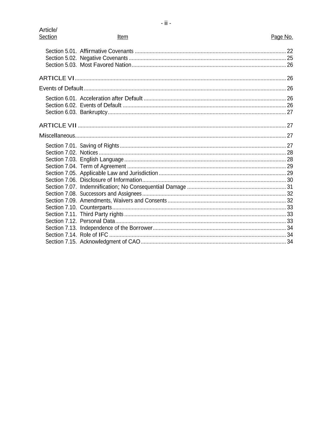 - ii - Article/ Section Item Page No. Section 5.01. Affirmative Covenants ..................................................................................................... 22 Section 5.02. Negative Covenants ......................................................................................................... 25 Section 5.03. Most Favored Nation ....................................................................................................... 26 ARTICLE VI ............................................................................................................................................. 26 Events of Default ....................................................................................................................................... 26 Section 6.01. Acceleration after Default ............................................................................................... 26 Section 6.02. Events of Default ............................................................................................................. 26 Section 6.03. Bankruptcy ....................................................................................................................... 27 ARTICLE VII ........................................................................................................................................... 27 Miscellaneous............................................................................................................................................. 27 Section 7.01. Saving of Rights ............................................................................................................... 27 Section 7.02. Notices ............................................................................................................................. 28 Section 7.03. English Language ............................................................................................................ 28 Section 7.04. Term of Agreement .......................................................................................................... 29 Section 7.05. Applicable Law and Jurisdiction ..................................................................................... 29 Section 7.06. Disclosure of Information ................................................................................................ 30 Section 7.07. Indemnification; No Consequential Damage .................................................................. 31 Section 7.08. Successors and Assignees ................................................................................................ 32 Section 7.09. Amendments, Waivers and Consents ............................................................................... 32 Section 7.10. Counterparts .................................................................................................................... 33 Section 7.11. Third Party rights ............................................................................................................ 33 Section 7.12. Personal Data .................................................................................................................. 33 Section 7.13. Independence of the Borrower ......................................................................................... 34 Section 7.14. Role of IFC ...................................................................................................................... 34 Section 7.15. Acknowledgment of CAO ................................................................................................. 34