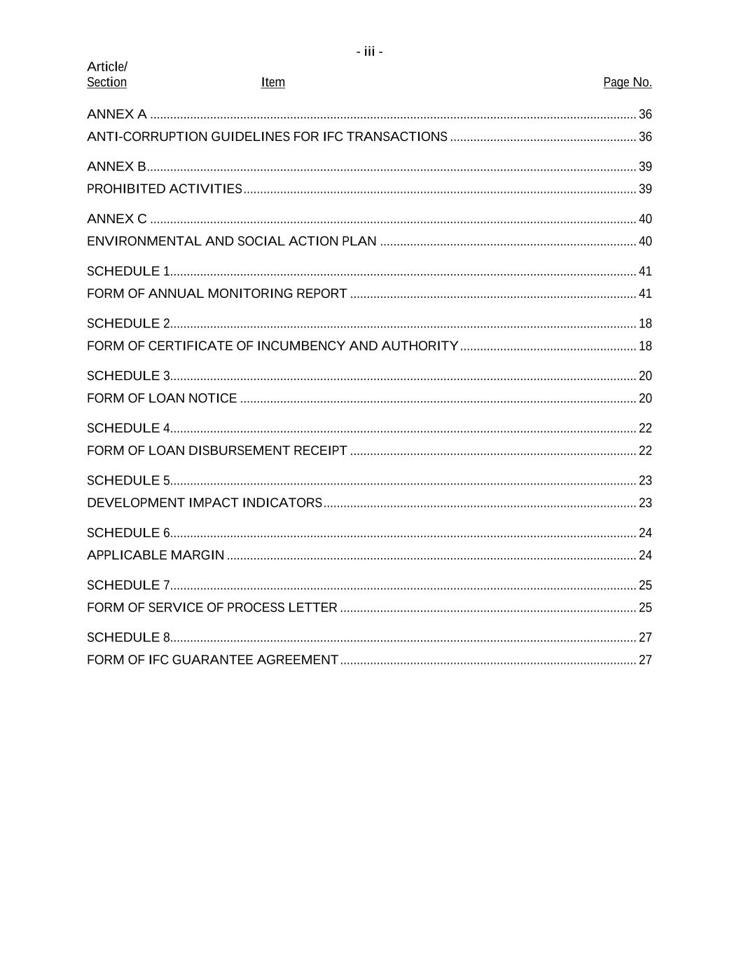 - iii - Article/ Section Item Page No. ANNEX A .................................................................................................................................................. 36 ANTI-CORRUPTION GUIDELINES FOR IFC TRANSACTIONS ........................................................ 36 ANNEX B ................................................................................................................................................... 39 PROHIBITED ACTIVITIES ...................................................................................................................... 39 ANNEX C .................................................................................................................................................. 40 ENVIRONMENTAL AND SOCIAL ACTION PLAN ............................................................................. 40 SCHEDULE 1............................................................................................................................................ 41 FORM OF ANNUAL MONITORING REPORT ...................................................................................... 41 SCHEDULE 2............................................................................................................................................ 18 FORM OF CERTIFICATE OF INCUMBENCY AND AUTHORITY ..................................................... 18 SCHEDULE 3............................................................................................................................................ 20 FORM OF LOAN NOTICE ....................................................................................................................... 20 SCHEDULE 4............................................................................................................................................ 22 FORM OF LOAN DISBURSEMENT RECEIPT ...................................................................................... 22 SCHEDULE 5............................................................................................................................................ 23 DEVELOPMENT IMPACT INDICATORS .............................................................................................. 23 SCHEDULE 6............................................................................................................................................ 24 APPLICABLE MARGIN ........................................................................................................................... 24 SCHEDULE 7............................................................................................................................................ 25 FORM OF SERVICE OF PROCESS LETTER ......................................................................................... 25 SCHEDULE 8............................................................................................................................................ 27 FORM OF IFC GUARANTEE AGREEMENT ......................................................................................... 27