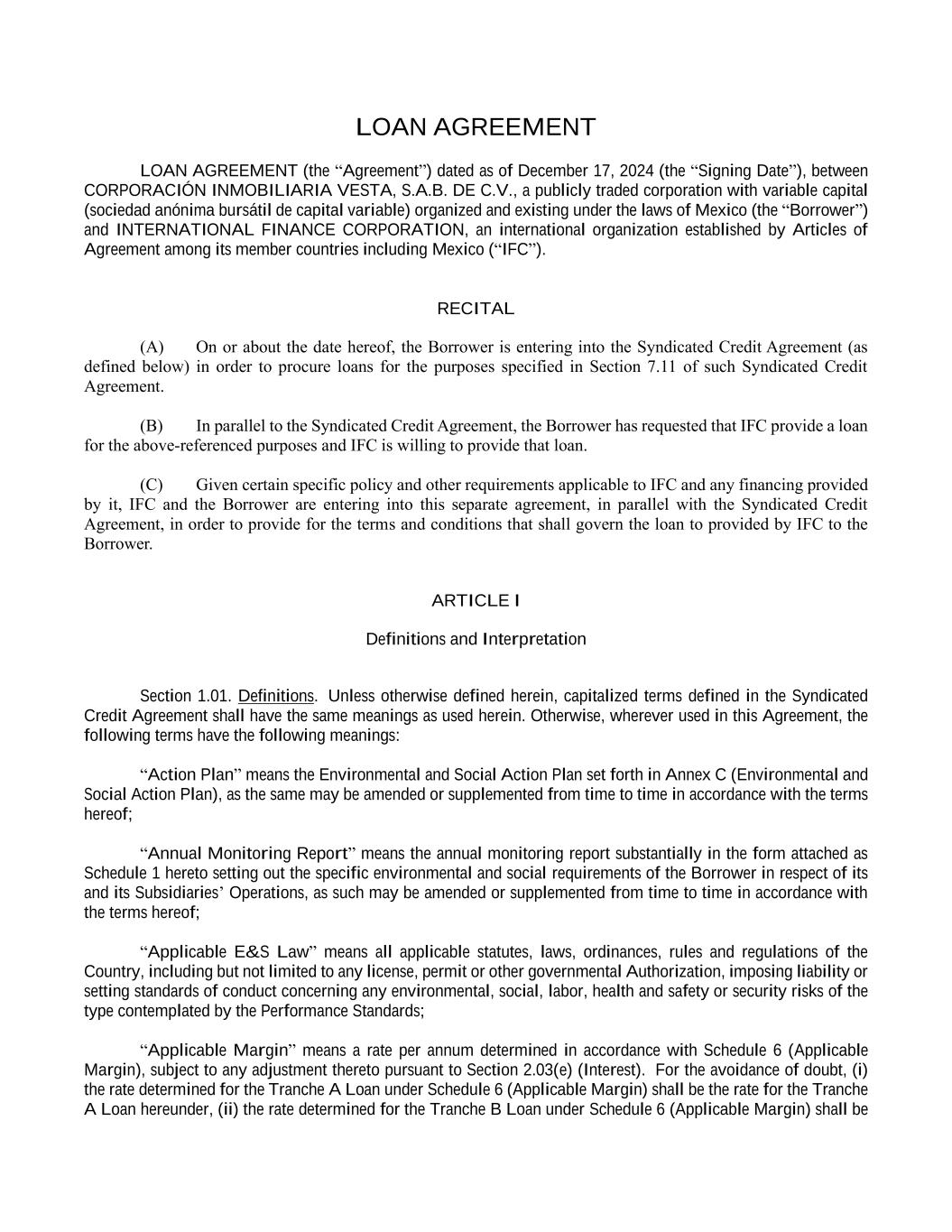 LOAN AGREEMENT LOAN AGREEMENT (the “Agreement”) dated as of December 17, 2024 (the “Signing Date”), between CORPORACIÓN INMOBILIARIA VESTA, S.A.B. DE C.V., a publicly traded corporation with variable capital (sociedad anónima bursátil de capital variable) organized and existing under the laws of Mexico (the “Borrower”) and INTERNATIONAL FINANCE CORPORATION, an international organization established by Articles of Agreement among its member countries including Mexico (“IFC”). RECITAL (A) On or about the date hereof, the Borrower is entering into the Syndicated Credit Agreement (as defined below) in order to procure loans for the purposes specified in Section 7.11 of such Syndicated Credit Agreement. (B) In parallel to the Syndicated Credit Agreement, the Borrower has requested that IFC provide a loan for the above-referenced purposes and IFC is willing to provide that loan. (C) Given certain specific policy and other requirements applicable to IFC and any financing provided by it, IFC and the Borrower are entering into this separate agreement, in parallel with the Syndicated Credit Agreement, in order to provide for the terms and conditions that shall govern the loan to provided by IFC to the Borrower. ARTICLE I Definitions and Interpretation Section 1.01. Definitions. Unless otherwise defined herein, capitalized terms defined in the Syndicated Credit Agreement shall have the same meanings as used herein. Otherwise, wherever used in this Agreement, the following terms have the following meanings: “Action Plan” means the Environmental and Social Action Plan set forth in Annex C (Environmental and Social Action Plan), as the same may be amended or supplemented from time to time in accordance with the terms hereof; “Annual Monitoring Report” means the annual monitoring report substantially in the form attached as Schedule 1 hereto setting out the specific environmental and social requirements of the Borrower in respect of its and its Subsidiaries’ Operations, as such may be amended or supplemented from time to time in accordance with the terms hereof; “Applicable E&S Law” means all applicable statutes, laws, ordinances, rules and regulations of the Country, including but not limited to any license, permit or other governmental Authorization, imposing liability or setting standards of conduct concerning any environmental, social, labor, health and safety or security risks of the type contemplated by the Performance Standards; “Applicable Margin” means a rate per annum determined in accordance with Schedule 6 (Applicable Margin), subject to any adjustment thereto pursuant to Section 2.03(e) (Interest). For the avoidance of doubt, (i) the rate determined for the Tranche A Loan under Schedule 6 (Applicable Margin) shall be the rate for the Tranche A Loan hereunder, (ii) the rate determined for the Tranche B Loan under Schedule 6 (Applicable Margin) shall be