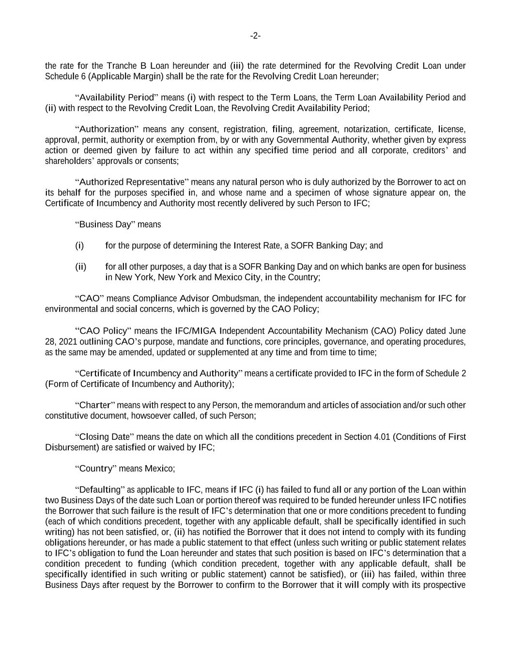 -2- the rate for the Tranche B Loan hereunder and (iii) the rate determined for the Revolving Credit Loan under Schedule 6 (Applicable Margin) shall be the rate for the Revolving Credit Loan hereunder; “Availability Period” means (i) with respect to the Term Loans, the Term Loan Availability Period and (ii) with respect to the Revolving Credit Loan, the Revolving Credit Availability Period; “Authorization” means any consent, registration, filing, agreement, notarization, certificate, license, approval, permit, authority or exemption from, by or with any Governmental Authority, whether given by express action or deemed given by failure to act within any specified time period and all corporate, creditors’ and shareholders’ approvals or consents; “Authorized Representative” means any natural person who is duly authorized by the Borrower to act on its behalf for the purposes specified in, and whose name and a specimen of whose signature appear on, the Certificate of Incumbency and Authority most recently delivered by such Person to IFC; “Business Day” means (i) for the purpose of determining the Interest Rate, a SOFR Banking Day; and (ii) for all other purposes, a day that is a SOFR Banking Day and on which banks are open for business in New York, New York and Mexico City, in the Country; “CAO” means Compliance Advisor Ombudsman, the independent accountability mechanism for IFC for environmental and social concerns, which is governed by the CAO Policy; “CAO Policy” means the IFC/MIGA Independent Accountability Mechanism (CAO) Policy dated June 28, 2021 outlining CAO’s purpose, mandate and functions, core principles, governance, and operating procedures, as the same may be amended, updated or supplemented at any time and from time to time; “Certificate of Incumbency and Authority” means a certificate provided to IFC in the form of Schedule 2 (Form of Certificate of Incumbency and Authority); “Charter” means with respect to any Person, the memorandum and articles of association and/or such other constitutive document, howsoever called, of such Person; “Closing Date” means the date on which all the conditions precedent in Section 4.01 (Conditions of First Disbursement) are satisfied or waived by IFC; “Country” means Mexico; “Defaulting” as applicable to IFC, means if IFC (i) has failed to fund all or any portion of the Loan within two Business Days of the date such Loan or portion thereof was required to be funded hereunder unless IFC notifies the Borrower that such failure is the result of IFC’s determination that one or more conditions precedent to funding (each of which conditions precedent, together with any applicable default, shall be specifically identified in such writing) has not been satisfied, or, (ii) has notified the Borrower that it does not intend to comply with its funding obligations hereunder, or has made a public statement to that effect (unless such writing or public statement relates to IFC’s obligation to fund the Loan hereunder and states that such position is based on IFC’s determination that a condition precedent to funding (which condition precedent, together with any applicable default, shall be specifically identified in such writing or public statement) cannot be satisfied), or (iii) has failed, within three Business Days after request by the Borrower to confirm to the Borrower that it will comply with its prospective