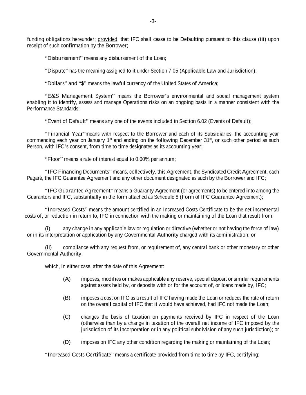 -3- funding obligations hereunder; provided, that IFC shall cease to be Defaulting pursuant to this clause (iii) upon receipt of such confirmation by the Borrower; “Disbursement” means any disbursement of the Loan; “Dispute” has the meaning assigned to it under Section 7.05 (Applicable Law and Jurisdiction); “Dollars” and “$” means the lawful currency of the United States of America; “E&S Management System” means the Borrower’s environmental and social management system enabling it to identify, assess and manage Operations risks on an ongoing basis in a manner consistent with the Performance Standards; “Event of Default” means any one of the events included in Section 6.02 (Events of Default); “Financial Year”means with respect to the Borrower and each of its Subsidiaries, the accounting year commencing each year on January 1st and ending on the following December 31st, or such other period as such Person, with IFC’s consent, from time to time designates as its accounting year; “Floor” means a rate of interest equal to 0.00% per annum; “IFC Financing Documents” means, collectively, this Agreement, the Syndicated Credit Agreement, each Pagaré, the IFC Guarantee Agreement and any other document designated as such by the Borrower and IFC; “IFC Guarantee Agreement” means a Guaranty Agreement (or agreements) to be entered into among the Guarantors and IFC, substantially in the form attached as Schedule 8 (Form of IFC Guarantee Agreement); “Increased Costs” means the amount certified in an Increased Costs Certificate to be the net incremental costs of, or reduction in return to, IFC in connection with the making or maintaining of the Loan that result from: (i) any change in any applicable law or regulation or directive (whether or not having the force of law) or in its interpretation or application by any Governmental Authority charged with its administration; or (ii) compliance with any request from, or requirement of, any central bank or other monetary or other Governmental Authority; which, in either case, after the date of this Agreement: (A) imposes, modifies or makes applicable any reserve, special deposit or similar requirements against assets held by, or deposits with or for the account of, or loans made by, IFC; (B) imposes a cost on IFC as a result of IFC having made the Loan or reduces the rate of return on the overall capital of IFC that it would have achieved, had IFC not made the Loan; (C) changes the basis of taxation on payments received by IFC in respect of the Loan (otherwise than by a change in taxation of the overall net income of IFC imposed by the jurisdiction of its incorporation or in any political subdivision of any such jurisdiction); or (D) imposes on IFC any other condition regarding the making or maintaining of the Loan; “Increased Costs Certificate” means a certificate provided from time to time by IFC, certifying: