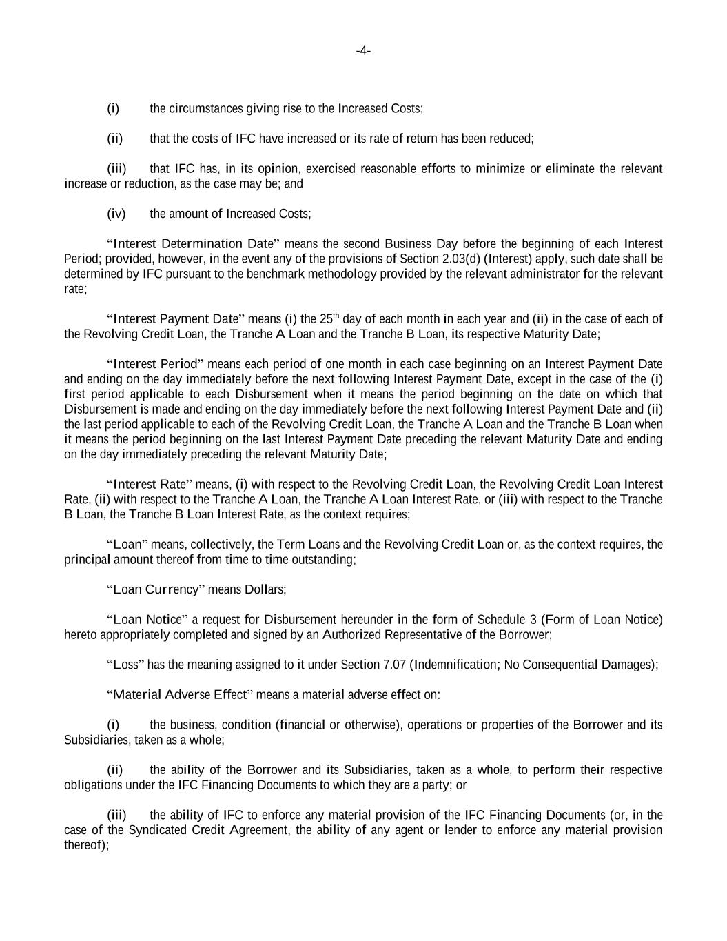 -4- (i) the circumstances giving rise to the Increased Costs; (ii) that the costs of IFC have increased or its rate of return has been reduced; (iii) that IFC has, in its opinion, exercised reasonable efforts to minimize or eliminate the relevant increase or reduction, as the case may be; and (iv) the amount of Increased Costs; “Interest Determination Date” means the second Business Day before the beginning of each Interest Period; provided, however, in the event any of the provisions of Section 2.03(d) (Interest) apply, such date shall be determined by IFC pursuant to the benchmark methodology provided by the relevant administrator for the relevant rate; “Interest Payment Date” means (i) the 25th day of each month in each year and (ii) in the case of each of the Revolving Credit Loan, the Tranche A Loan and the Tranche B Loan, its respective Maturity Date; “Interest Period” means each period of one month in each case beginning on an Interest Payment Date and ending on the day immediately before the next following Interest Payment Date, except in the case of the (i) first period applicable to each Disbursement when it means the period beginning on the date on which that Disbursement is made and ending on the day immediately before the next following Interest Payment Date and (ii) the last period applicable to each of the Revolving Credit Loan, the Tranche A Loan and the Tranche B Loan when it means the period beginning on the last Interest Payment Date preceding the relevant Maturity Date and ending on the day immediately preceding the relevant Maturity Date; “Interest Rate” means, (i) with respect to the Revolving Credit Loan, the Revolving Credit Loan Interest Rate, (ii) with respect to the Tranche A Loan, the Tranche A Loan Interest Rate, or (iii) with respect to the Tranche B Loan, the Tranche B Loan Interest Rate, as the context requires; “Loan” means, collectively, the Term Loans and the Revolving Credit Loan or, as the context requires, the principal amount thereof from time to time outstanding; “Loan Currency” means Dollars; “Loan Notice” a request for Disbursement hereunder in the form of Schedule 3 (Form of Loan Notice) hereto appropriately completed and signed by an Authorized Representative of the Borrower; “Loss” has the meaning assigned to it under Section 7.07 (Indemnification; No Consequential Damages); “Material Adverse Effect” means a material adverse effect on: (i) the business, condition (financial or otherwise), operations or properties of the Borrower and its Subsidiaries, taken as a whole; (ii) the ability of the Borrower and its Subsidiaries, taken as a whole, to perform their respective obligations under the IFC Financing Documents to which they are a party; or (iii) the ability of IFC to enforce any material provision of the IFC Financing Documents (or, in the case of the Syndicated Credit Agreement, the ability of any agent or lender to enforce any material provision thereof);
