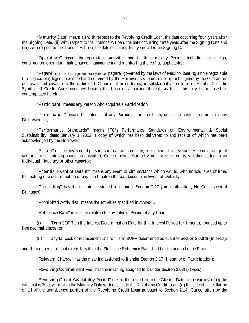 -5- “Maturity Date” means (i) with respect to the Revolving Credit Loan, the date occurring four years after the Signing Date, (ii) with respect to the Tranche A Loan, the date occurring three years after the Signing Date and (iii) with respect to the Tranche B Loan, the date occurring five years after the Signing Date; “Operations” means the operations, activities and facilities of any Person (including the design, construction, operation, maintenance, management and monitoring thereof, as applicable); “Pagaré” means each promissory note (pagaré) governed by the laws of Mexico, bearing a non-negotiable (no negociable) legend, executed and delivered by the Borrower, as issuer (suscriptor), signed by the Guarantors por aval, and payable to the order of IFC pursuant to its terms, in substantially the form of Exhibit C to the Syndicated Credit Agreement, evidencing the Loan or a portion thereof, as the same may be replaced as contemplated herein; “Participant” means any Person who acquires a Participation; “Participation” means the interest of any Participant in the Loan, or as the context requires, in any Disbursement; “Performance Standards” means IFC’s Performance Standards on Environmental & Social Sustainability, dated January 1, 2012, a copy of which has been delivered to and receipt of which has been acknowledged by the Borrower; “Person” means any natural person, corporation, company, partnership, firm, voluntary association, joint venture, trust, unincorporated organization, Governmental Authority or any other entity whether acting in an individual, fiduciary or other capacity; “Potential Event of Default” means any event or circumstance which would, with notice, lapse of time, the making of a determination or any combination thereof, become an Event of Default; “Proceeding” has the meaning assigned to it under Section 7.07 (Indemnification; No Consequential Damages); “Prohibited Activities” means the activities specified in Annex B; “Reference Rate” means, in relation to any Interest Period of any Loan: (i) Term SOFR on the Interest Determination Date for that Interest Period for 1 month, rounded up to five decimal places; or (ii) any fallback or replacement rate for Term SOFR determined pursuant to Section 2.03(d) (Interest); and if, in either case, that rate is less than the Floor, the Reference Rate shall be deemed to be the Floor; “Relevant Change” has the meaning assigned to it under Section 2.17 (Illegality of Participation); “Revolving Commitment Fee” has the meaning assigned to it under Section 2.08(a) (Fees); “Revolving Credit Availability Period” means the period from the Closing Date to the earliest of (i) the date that is 30 days prior to the Maturity Date with respect to the Revolving Credit Loan, (ii) the date of cancellation of all of the undisbursed portion of the Revolving Credit Loan pursuant to Section 2.14 (Cancellation by the