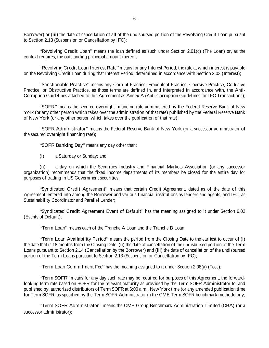 -6- Borrower) or (iii) the date of cancellation of all of the undisbursed portion of the Revolving Credit Loan pursuant to Section 2.13 (Suspension or Cancellation by IFC); “Revolving Credit Loan” means the loan defined as such under Section 2.01(c) (The Loan) or, as the context requires, the outstanding principal amount thereof; “Revolving Credit Loan Interest Rate” means for any Interest Period, the rate at which interest is payable on the Revolving Credit Loan during that Interest Period, determined in accordance with Section 2.03 (Interest); “Sanctionable Practice” means any Corrupt Practice, Fraudulent Practice, Coercive Practice, Collusive Practice, or Obstructive Practice, as those terms are defined in, and interpreted in accordance with, the Anti- Corruption Guidelines attached to this Agreement as Annex A (Anti-Corruption Guidelines for IFC Transactions); “SOFR” means the secured overnight financing rate administered by the Federal Reserve Bank of New York (or any other person which takes over the administration of that rate) published by the Federal Reserve Bank of New York (or any other person which takes over the publication of that rate); “SOFR Administrator” means the Federal Reserve Bank of New York (or a successor administrator of the secured overnight financing rate); “SOFR Banking Day” means any day other than: (i) a Saturday or Sunday; and (ii) a day on which the Securities Industry and Financial Markets Association (or any successor organization) recommends that the fixed income departments of its members be closed for the entire day for purposes of trading in US Government securities; “Syndicated Credit Agreement” means that certain Credit Agreement, dated as of the date of this Agreement, entered into among the Borrower and various financial institutions as lenders and agents, and IFC, as Sustainability Coordinator and Parallel Lender; “Syndicated Credit Agreement Event of Default” has the meaning assigned to it under Section 6.02 (Events of Default); “Term Loan” means each of the Tranche A Loan and the Tranche B Loan; “Term Loan Availability Period” means the period from the Closing Date to the earliest to occur of (i) the date that is 18 months from the Closing Date, (ii) the date of cancellation of the undisbursed portion of the Term Loans pursuant to Section 2.14 (Cancellation by the Borrower) and (iii) the date of cancellation of the undisbursed portion of the Term Loans pursuant to Section 2.13 (Suspension or Cancellation by IFC); “Term Loan Commitment Fee” has the meaning assigned to it under Section 2.08(a) (Fees); “Term SOFR” means for any day such rate may be required for purposes of this Agreement, the forward- looking term rate based on SOFR for the relevant maturity as provided by the Term SOFR Administrator to, and published by, authorized distributors of Term SOFR at 6:00 a.m., New York time (or any amended publication time for Term SOFR, as specified by the Term SOFR Administrator in the CME Term SOFR benchmark methodology; “Term SOFR Administrator” means the CME Group Benchmark Administration Limited (CBA) (or a successor administrator);