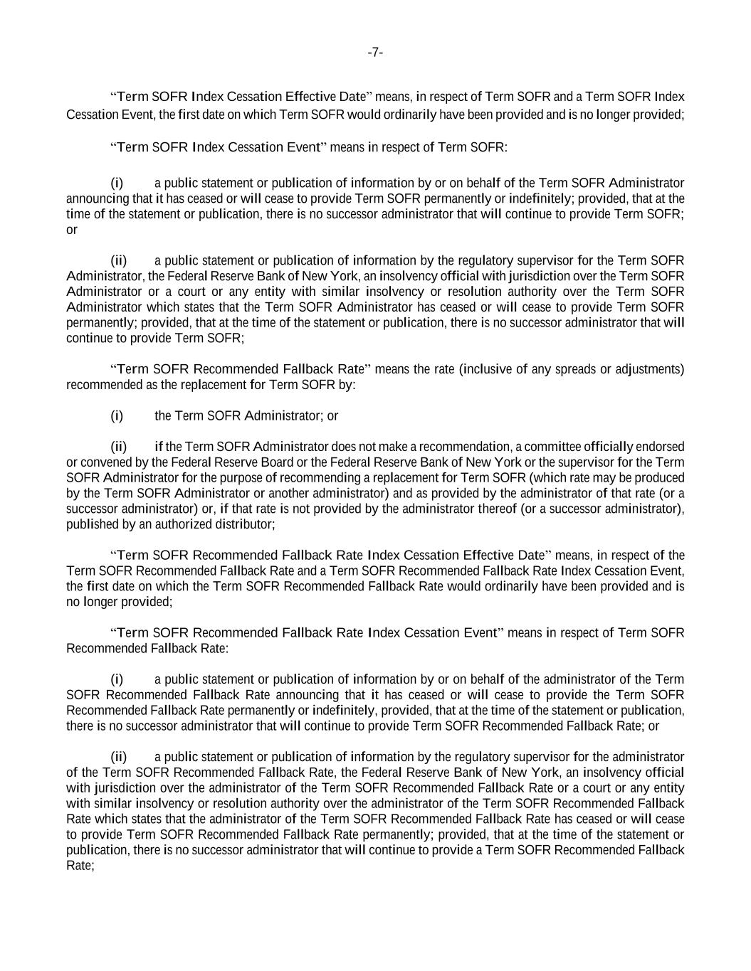 -7- “Term SOFR Index Cessation Effective Date” means, in respect of Term SOFR and a Term SOFR Index Cessation Event, the first date on which Term SOFR would ordinarily have been provided and is no longer provided; “Term SOFR Index Cessation Event” means in respect of Term SOFR: (i) a public statement or publication of information by or on behalf of the Term SOFR Administrator announcing that it has ceased or will cease to provide Term SOFR permanently or indefinitely; provided, that at the time of the statement or publication, there is no successor administrator that will continue to provide Term SOFR; or (ii) a public statement or publication of information by the regulatory supervisor for the Term SOFR Administrator, the Federal Reserve Bank of New York, an insolvency official with jurisdiction over the Term SOFR Administrator or a court or any entity with similar insolvency or resolution authority over the Term SOFR Administrator which states that the Term SOFR Administrator has ceased or will cease to provide Term SOFR permanently; provided, that at the time of the statement or publication, there is no successor administrator that will continue to provide Term SOFR; “Term SOFR Recommended Fallback Rate” means the rate (inclusive of any spreads or adjustments) recommended as the replacement for Term SOFR by: (i) the Term SOFR Administrator; or (ii) if the Term SOFR Administrator does not make a recommendation, a committee officially endorsed or convened by the Federal Reserve Board or the Federal Reserve Bank of New York or the supervisor for the Term SOFR Administrator for the purpose of recommending a replacement for Term SOFR (which rate may be produced by the Term SOFR Administrator or another administrator) and as provided by the administrator of that rate (or a successor administrator) or, if that rate is not provided by the administrator thereof (or a successor administrator), published by an authorized distributor; “Term SOFR Recommended Fallback Rate Index Cessation Effective Date” means, in respect of the Term SOFR Recommended Fallback Rate and a Term SOFR Recommended Fallback Rate Index Cessation Event, the first date on which the Term SOFR Recommended Fallback Rate would ordinarily have been provided and is no longer provided; “Term SOFR Recommended Fallback Rate Index Cessation Event” means in respect of Term SOFR Recommended Fallback Rate: (i) a public statement or publication of information by or on behalf of the administrator of the Term SOFR Recommended Fallback Rate announcing that it has ceased or will cease to provide the Term SOFR Recommended Fallback Rate permanently or indefinitely, provided, that at the time of the statement or publication, there is no successor administrator that will continue to provide Term SOFR Recommended Fallback Rate; or (ii) a public statement or publication of information by the regulatory supervisor for the administrator of the Term SOFR Recommended Fallback Rate, the Federal Reserve Bank of New York, an insolvency official with jurisdiction over the administrator of the Term SOFR Recommended Fallback Rate or a court or any entity with similar insolvency or resolution authority over the administrator of the Term SOFR Recommended Fallback Rate which states that the administrator of the Term SOFR Recommended Fallback Rate has ceased or will cease to provide Term SOFR Recommended Fallback Rate permanently; provided, that at the time of the statement or publication, there is no successor administrator that will continue to provide a Term SOFR Recommended Fallback Rate;