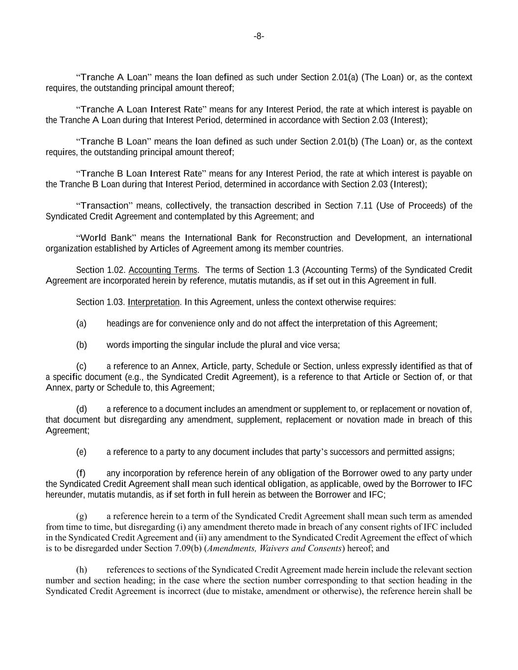 -8- “Tranche A Loan” means the loan defined as such under Section 2.01(a) (The Loan) or, as the context requires, the outstanding principal amount thereof; “Tranche A Loan Interest Rate” means for any Interest Period, the rate at which interest is payable on the Tranche A Loan during that Interest Period, determined in accordance with Section 2.03 (Interest); “Tranche B Loan” means the loan defined as such under Section 2.01(b) (The Loan) or, as the context requires, the outstanding principal amount thereof; “Tranche B Loan Interest Rate” means for any Interest Period, the rate at which interest is payable on the Tranche B Loan during that Interest Period, determined in accordance with Section 2.03 (Interest); “Transaction” means, collectively, the transaction described in Section 7.11 (Use of Proceeds) of the Syndicated Credit Agreement and contemplated by this Agreement; and “World Bank” means the International Bank for Reconstruction and Development, an international organization established by Articles of Agreement among its member countries. Section 1.02. Accounting Terms. The terms of Section 1.3 (Accounting Terms) of the Syndicated Credit Agreement are incorporated herein by reference, mutatis mutandis, as if set out in this Agreement in full. Section 1.03. Interpretation. In this Agreement, unless the context otherwise requires: (a) headings are for convenience only and do not affect the interpretation of this Agreement; (b) words importing the singular include the plural and vice versa; (c) a reference to an Annex, Article, party, Schedule or Section, unless expressly identified as that of a specific document (e.g., the Syndicated Credit Agreement), is a reference to that Article or Section of, or that Annex, party or Schedule to, this Agreement; (d) a reference to a document includes an amendment or supplement to, or replacement or novation of, that document but disregarding any amendment, supplement, replacement or novation made in breach of this Agreement; (e) a reference to a party to any document includes that party’s successors and permitted assigns; (f) any incorporation by reference herein of any obligation of the Borrower owed to any party under the Syndicated Credit Agreement shall mean such identical obligation, as applicable, owed by the Borrower to IFC hereunder, mutatis mutandis, as if set forth in full herein as between the Borrower and IFC; (g) a reference herein to a term of the Syndicated Credit Agreement shall mean such term as amended from time to time, but disregarding (i) any amendment thereto made in breach of any consent rights of IFC included in the Syndicated Credit Agreement and (ii) any amendment to the Syndicated Credit Agreement the effect of which is to be disregarded under Section 7.09(b) (Amendments, Waivers and Consents) hereof; and (h) references to sections of the Syndicated Credit Agreement made herein include the relevant section number and section heading; in the case where the section number corresponding to that section heading in the Syndicated Credit Agreement is incorrect (due to mistake, amendment or otherwise), the reference herein shall be
