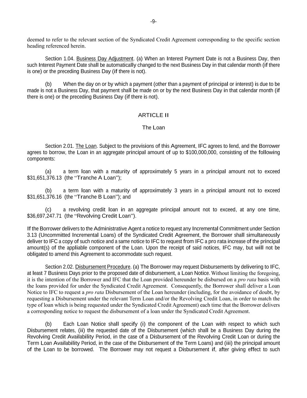 -9- deemed to refer to the relevant section of the Syndicated Credit Agreement corresponding to the specific section heading referenced herein. Section 1.04. Business Day Adjustment. (a) When an Interest Payment Date is not a Business Day, then such Interest Payment Date shall be automatically changed to the next Business Day in that calendar month (if there is one) or the preceding Business Day (if there is not). (b) When the day on or by which a payment (other than a payment of principal or interest) is due to be made is not a Business Day, that payment shall be made on or by the next Business Day in that calendar month (if there is one) or the preceding Business Day (if there is not). ARTICLE II The Loan Section 2.01. The Loan. Subject to the provisions of this Agreement, IFC agrees to lend, and the Borrower agrees to borrow, the Loan in an aggregate principal amount of up to $100,000,000, consisting of the following components: (a) a term loan with a maturity of approximately 5 years in a principal amount not to exceed $31,651,376.13 (the “Tranche A Loan”); (b) a term loan with a maturity of approximately 3 years in a principal amount not to exceed $31,651,376.16 (the “Tranche B Loan”); and (c) a revolving credit loan in an aggregate principal amount not to exceed, at any one time, $36,697,247.71 (the “Revolving Credit Loan”). If the Borrower delivers to the Administrative Agent a notice to request any Incremental Commitment under Section 3.13 (Uncommitted Incremental Loans) of the Syndicated Credit Agreement, the Borrower shall simultaneously deliver to IFC a copy of such notice and a same notice to IFC to request from IFC a pro rata increase of the principal amount(s) of the appliable component of the Loan. Upon the receipt of said notices, IFC may, but will not be obligated to amend this Agreement to accommodate such request. Section 2.02. Disbursement Procedure. (a) The Borrower may request Disbursements by delivering to IFC, at least 7 Business Days prior to the proposed date of disbursement, a Loan Notice. Without limiting the foregoing, it is the intention of the Borrower and IFC that the Loan provided hereunder be disbursed on a pro rata basis with the loans provided for under the Syndicated Credit Agreement. Consequently, the Borrower shall deliver a Loan Notice to IFC to request a pro rata Disbursement of the Loan hereunder (including, for the avoidance of doubt, by requesting a Disbursement under the relevant Term Loan and/or the Revolving Credit Loan, in order to match the type of loan which is being requested under the Syndicated Credit Agreement) each time that the Borrower delivers a corresponding notice to request the disbursement of a loan under the Syndicated Credit Agreement. (b) Each Loan Notice shall specify (i) the component of the Loan with respect to which such Disbursement relates, (ii) the requested date of the Disbursement (which shall be a Business Day during the Revolving Credit Availability Period, in the case of a Disbursement of the Revolving Credit Loan or during the Term Loan Availability Period, in the case of the Disbursement of the Term Loans) and (iii) the principal amount of the Loan to be borrowed. The Borrower may not request a Disbursement if, after giving effect to such
