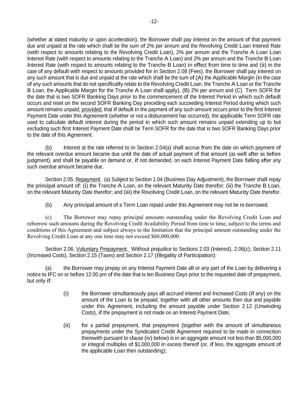 -12- (whether at stated maturity or upon acceleration), the Borrower shall pay interest on the amount of that payment due and unpaid at the rate which shall be the sum of 2% per annum and the Revolving Credit Loan Interest Rate (with respect to amounts relating to the Revolving Credit Loan), 2% per annum and the Tranche A Loan Loan Interest Rate (with respect to amounts relating to the Tranche A Loan) and 2% per annum and the Tranche B Loan Interest Rate (with respect to amounts relating to the Tranche B Loan) in effect from time to time and (ii) in the case of any default with respect to amounts provided for in Section 2.08 (Fees), the Borrower shall pay interest on any such amount that is due and unpaid at the rate which shall be the sum of (A) the Applicable Margin (in the case of any such amounts that do not specifically relate to the Revolving Credit Loan, the Tranche A Loan or the Tranche B Loan, the Applicable Margin for the Tranche A Loan shall apply), (B) 2% per annum and (C) Term SOFR for the date that is two SOFR Banking Days prior to the commencement of the Interest Period in which such default occurs and reset on the second SOFR Banking Day preceding each succeeding Interest Period during which such amount remains unpaid; provided, that if default in the payment of any such amount occurs prior to the first Interest Payment Date under this Agreement (whether or not a disbursement has occurred), the applicable Term SOFR rate used to calculate default interest during the period in which such amount remains unpaid extending up to but excluding such first Interest Payment Date shall be Term SOFR for the date that is two SOFR Banking Days prior to the date of this Agreement. (b) Interest at the rate referred to in Section 2.04(a) shall accrue from the date on which payment of the relevant overdue amount became due until the date of actual payment of that amount (as well after as before judgment), and shall be payable on demand or, if not demanded, on each Interest Payment Date falling after any such overdue amount became due. Section 2.05. Repayment. (a) Subject to Section 1.04 (Business Day Adjustment), the Borrower shall repay the principal amount of: (i) the Tranche A Loan, on the relevant Maturity Date therefor; (ii) the Tranche B Loan, on the relevant Maturity Date therefor; and (iii) the Revolving Credit Loan, on the relevant Maturity Date therefor. (b) Any principal amount of a Term Loan repaid under this Agreement may not be re-borrowed. (c) The Borrower may repay principal amounts outstanding under the Revolving Credit Loan and reborrow such amounts during the Revolving Credit Availability Period from time to time, subject to the terms and conditions of this Agreement and subject always to the limitation that the principal amount outstanding under the Revolving Credit Loan at any one time may not exceed $60,000,000. Section 2.06. Voluntary Prepayment. Without prejudice to Sections 2.03 (Interest), 2.06(c), Section 2.11 (Increased Costs), Section 2.15 (Taxes) and Section 2.17 (Illegality of Participation): (a) the Borrower may prepay on any Interest Payment Date all or any part of the Loan by delivering a notice to IFC on or before 12:00 pm of the date that is ten Business Days prior to the requested date of prepayment, but only if: (i) the Borrower simultaneously pays all accrued interest and Increased Costs (if any) on the amount of the Loan to be prepaid, together with all other amounts then due and payable under this Agreement, including the amount payable under Section 2.12 (Unwinding Costs), if the prepayment is not made on an Interest Payment Date; (ii) for a partial prepayment, that prepayment (together with the amount of simultaneous prepayments under the Syndicated Credit Agreement required to be made in connection therewith pursuant to clause (iv) below) is in an aggregate amount not less than $5,000,000 or integral multiples of $1,000,000 in excess thereof (or, if less, the aggregate amount of the applicable Loan then outstanding);